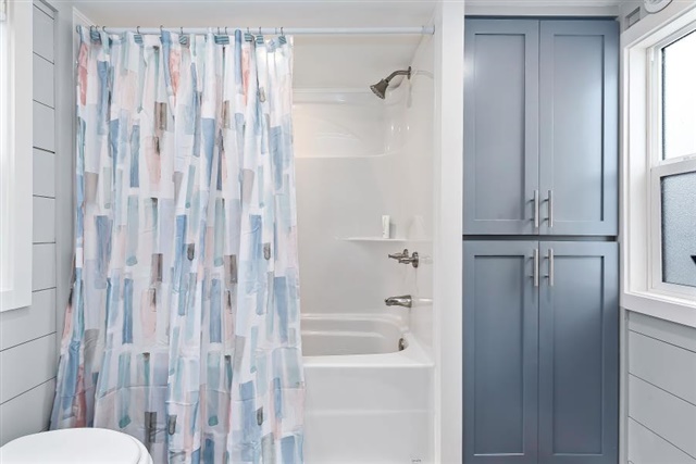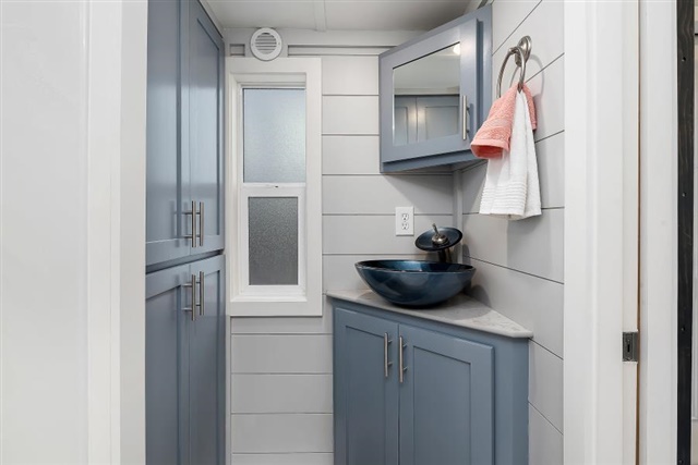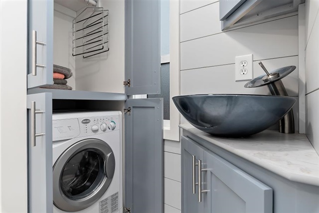 A well-thought-out and spacious bathroom complements the rest of the home's features. It boasts a shower-tub combination that provides an excellent way to unwind after a long day. To add an elegant touch, a crystal vessel sink sits atop a large closet with a waterfall faucet, ensuring the bathroom is as stylish as it is functional. With ample storage space, it becomes easy to keep all your personal items organized.