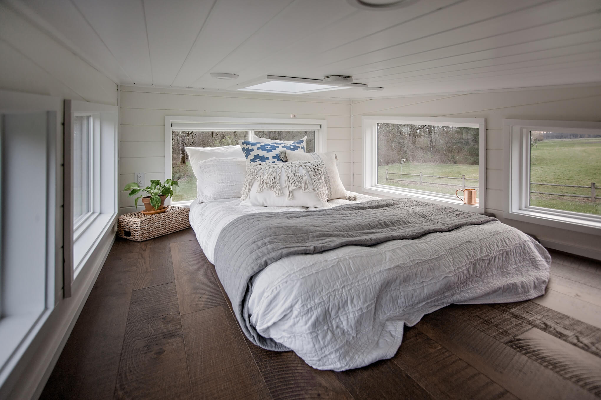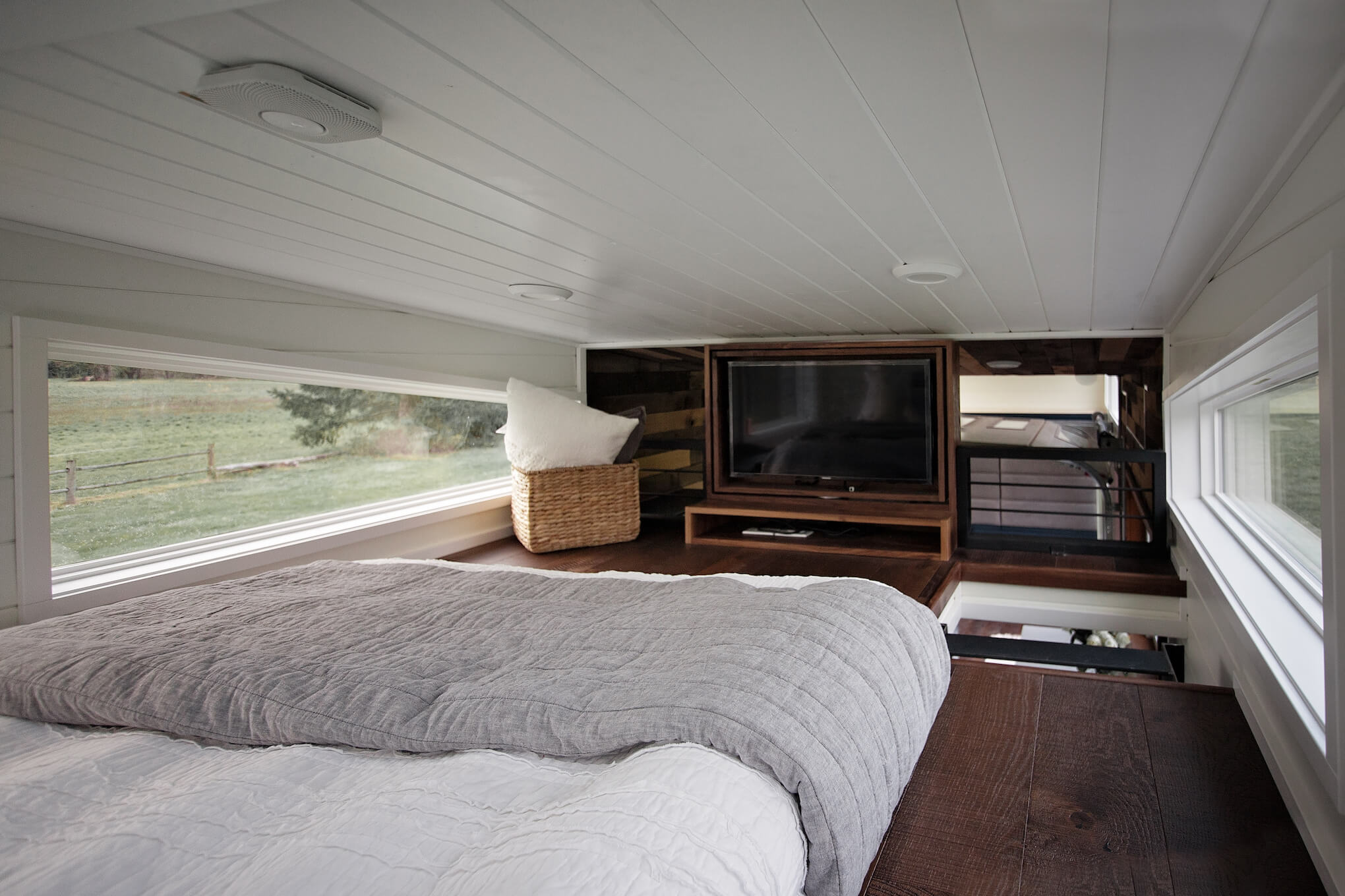 The bedroom loft is designed with comfort and functionality in mind. Once you enter the loft, you'll notice a TV that's mounted in a way that allows it to be reversible. Surrounding the TV, you'll find plenty of windows that allow natural light to fill the space. The abundance of natural light creates a bright and airy feel in the bedroom, making it a warm and inviting place to rest and recharge. In addition to the TV, the bedroom loft also has plenty of storage space, so you can keep your belongings organized and out of sight.