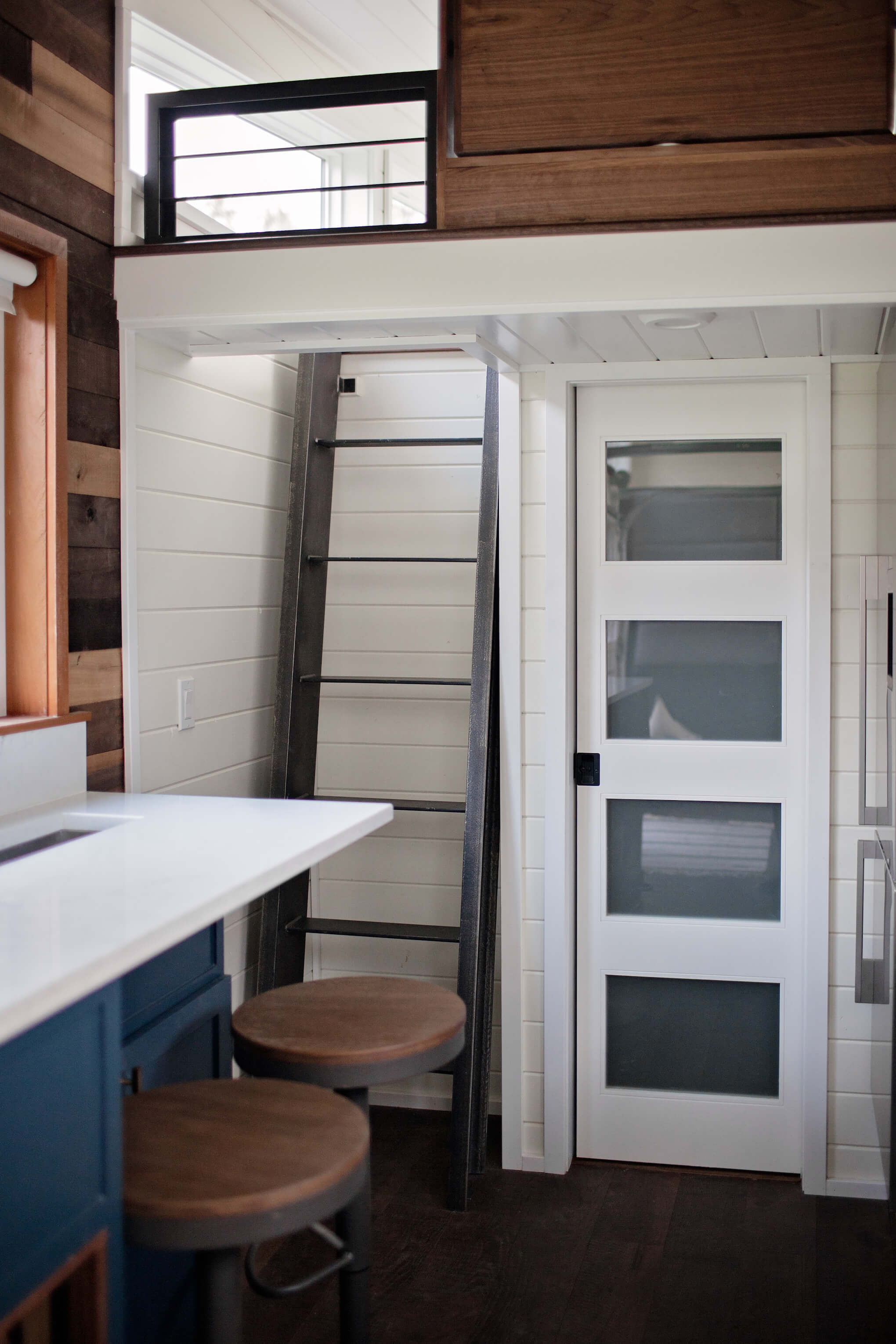 The Dutch entry door on one side of the living room, as well as the garage door on the other side, are quite noticeable from afar and add a distinct characteristic to the tiny house. The attention to detail on the doors and the exterior of the home set the tone for the exceptional experience that awaits inside.