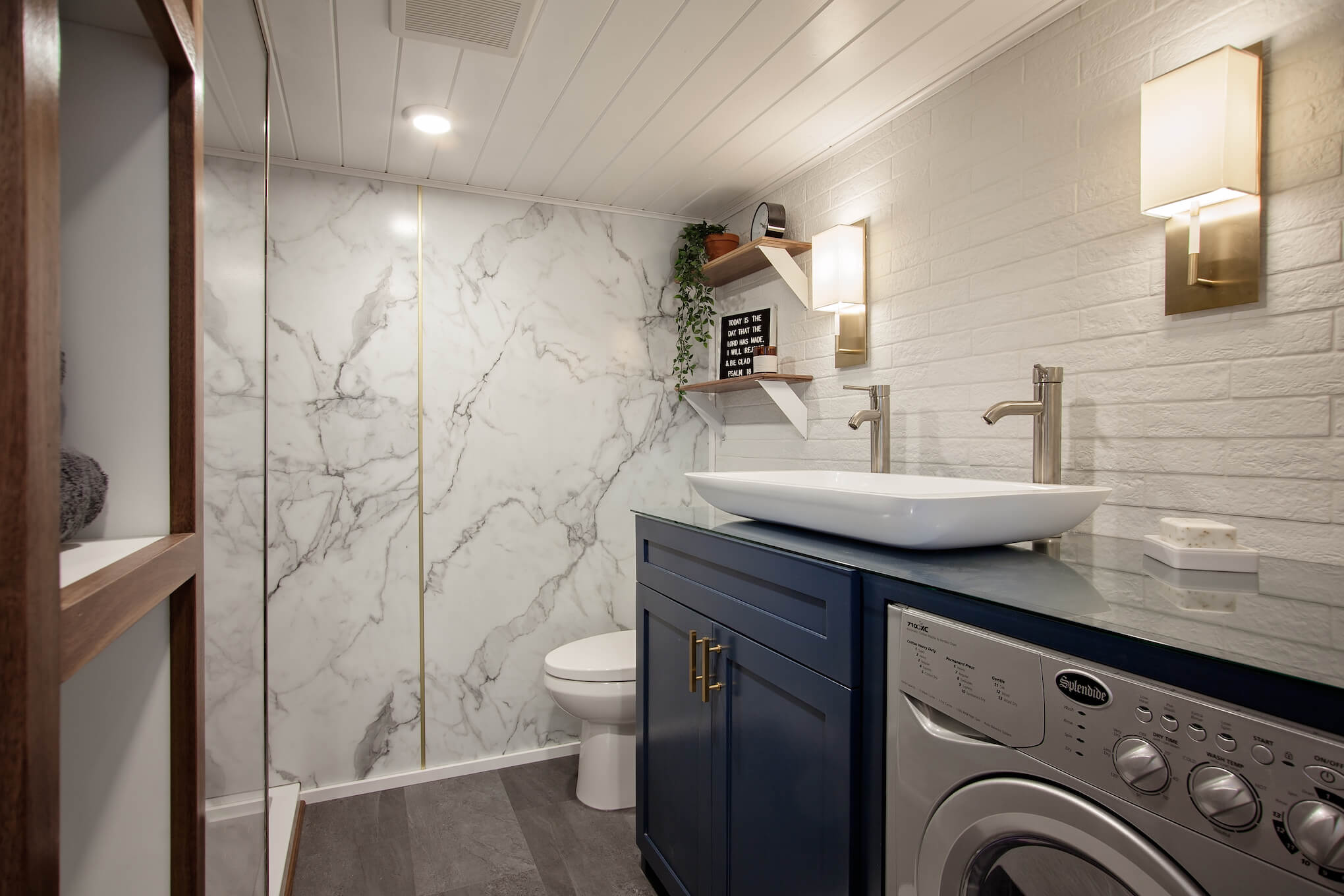 Located below the cozy bedroom loft is the luxurious master bathroom suite, equipped with high-end features and finishes. The bathroom features a beautiful vessel sink that is both functional and visually stunning. The shower is a true work of art, with its elegant herringbone pattern tile that adds texture and sophistication to the space. The master bath suite is topped off with ample storage space, making it easy to keep your bathroom essentials organized and within reach. The added bonus of a washer and dryer combo in the bathroom is a convenient and practical feature that saves space and allows you to wash and dry your clothes in one convenient location. Check out the full gallery here!