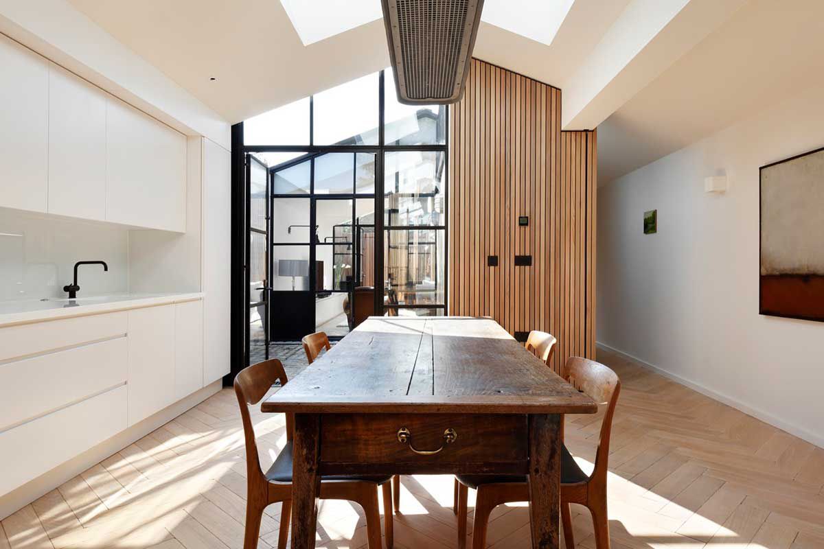 The exterior of the home, and feature walls and doors were created by cladding of two by two cedar bringing in tone and texture from the outside in, and an extremely unique feeling of the home, when it is juxtaposed against the white walls.