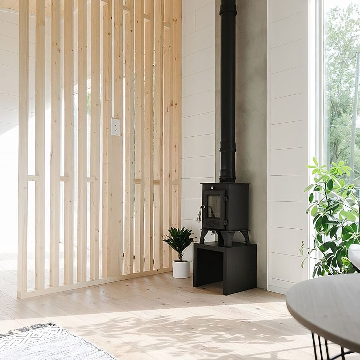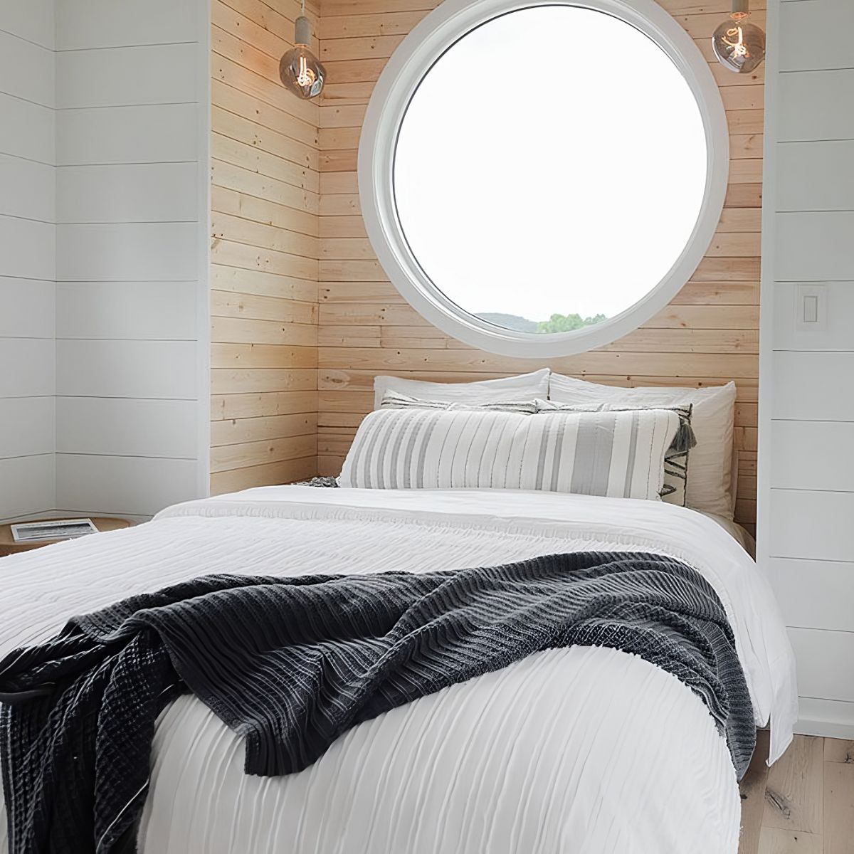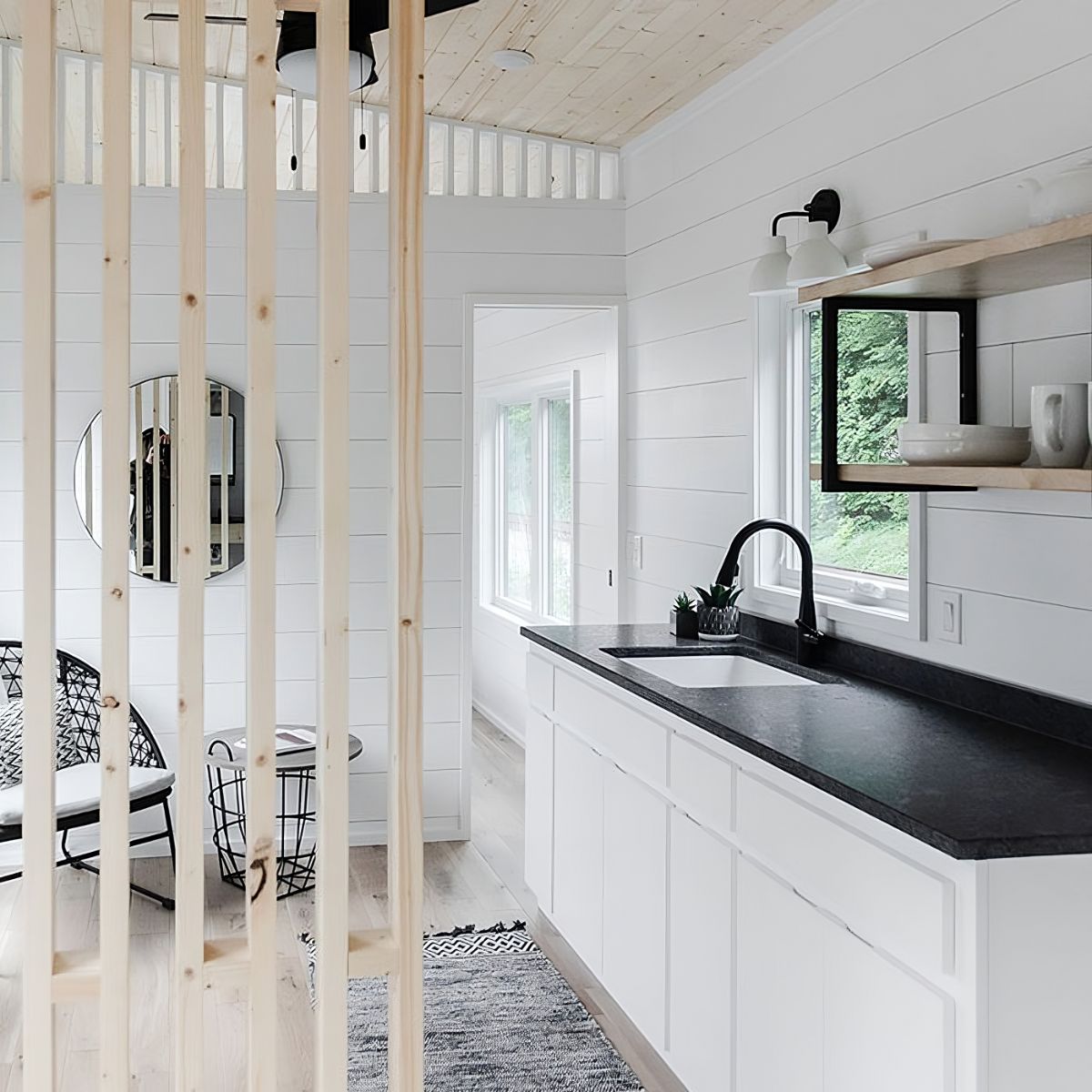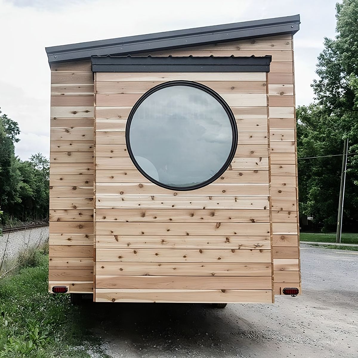 Check out The Etowah, a remarkable 32-foot tiny home that perfectly balances convenience, freedom, and comfort in a single-level, Scandinavian-inspired design. As you approach this stunning abode, you'll be captivated by its clean and simple aesthetic, featuring a unique round window and a beautiful tile transition that adds character to the house.