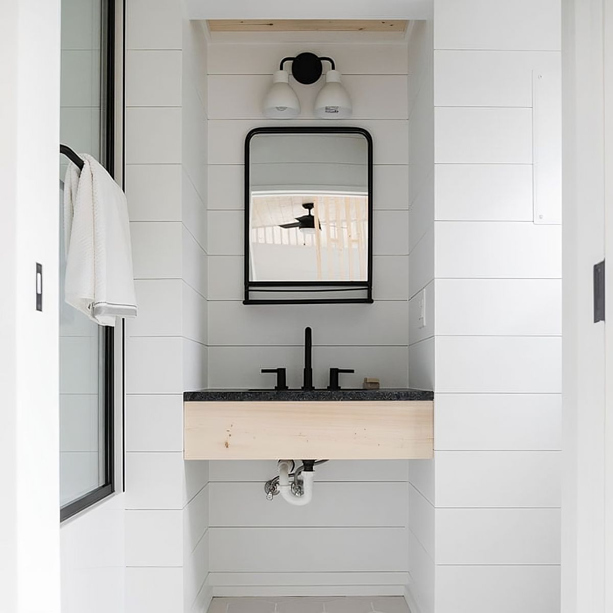 The well-appointed kitchen features closed lower cabinets with soft-close hardware and finish-grade plywood boxes, topped with a butcher block counter. The drop-in stainless or composite sink sits beneath open upper shelving, supported by square steel brackets that exude a modern touch.