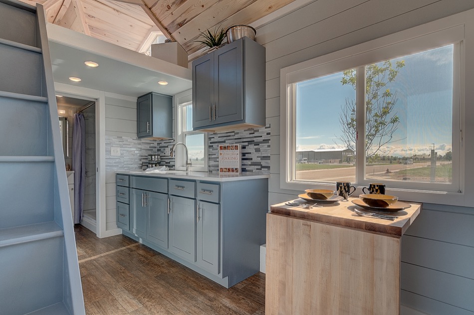 The kitchen is spacious with plenty of storage and countertop space and a butcher block fold-up table creates a unique dining experience right under a large picture framed window. Just past the dining and living room area you'll find the master on the main floor. At the opposite end of the tiny house is the master suite bathroom with marble tile walls.