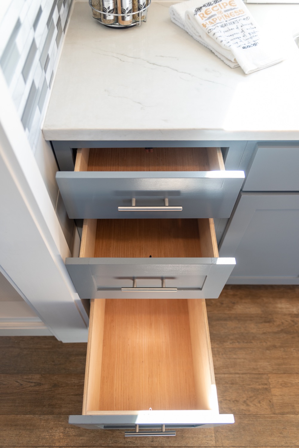 The exterior is glad with stained wood and painted siding giving it a nice two tone look. The name, K2, of course comes from its dual peak dormers that give the exterior a dynamic visual appearance and provide extra head room in the loft bedrooms. You'll also find a electric awning, wine chiller, and portable lithium batteries built into the exterior as well.