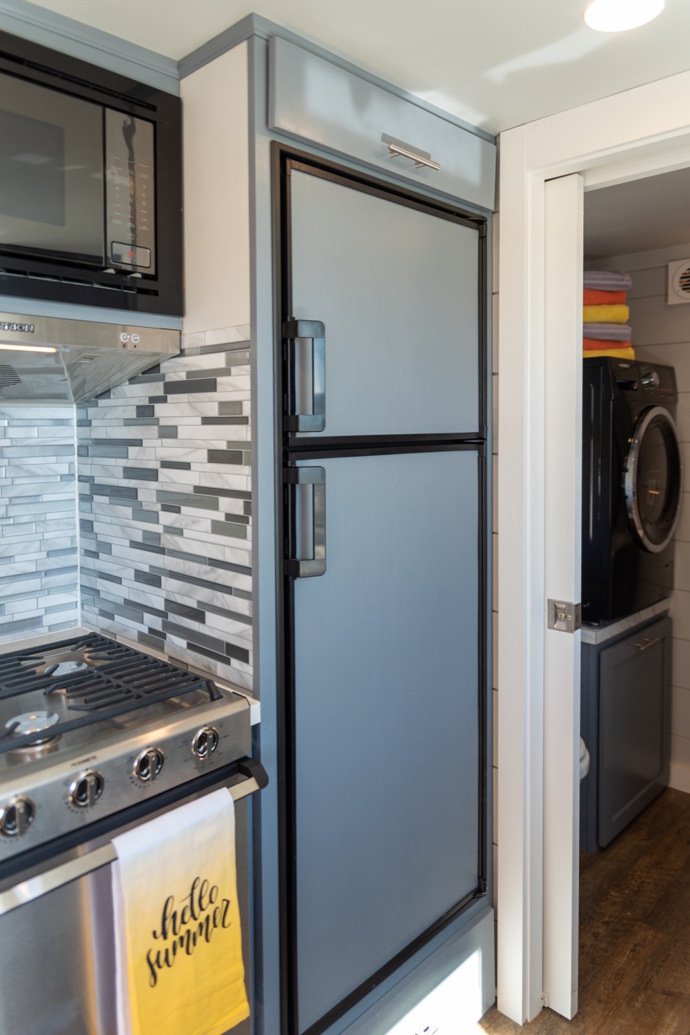 Inside you'll find the home is well outfitted with high-end Dometic appliances, washer and dryer combo, and solid craftsmanship throughout. The layout is fairly standard but brings a lot of space and function to a 26 foot tiny home on wheels.