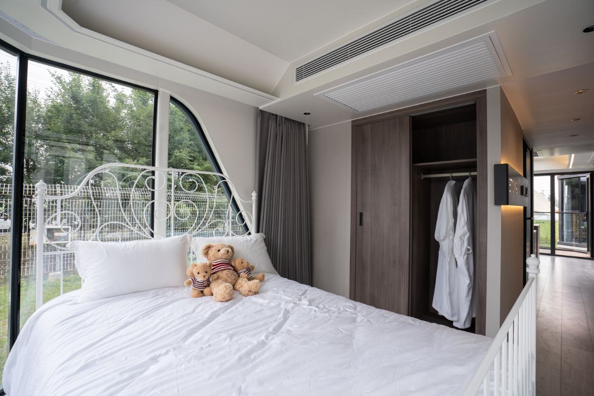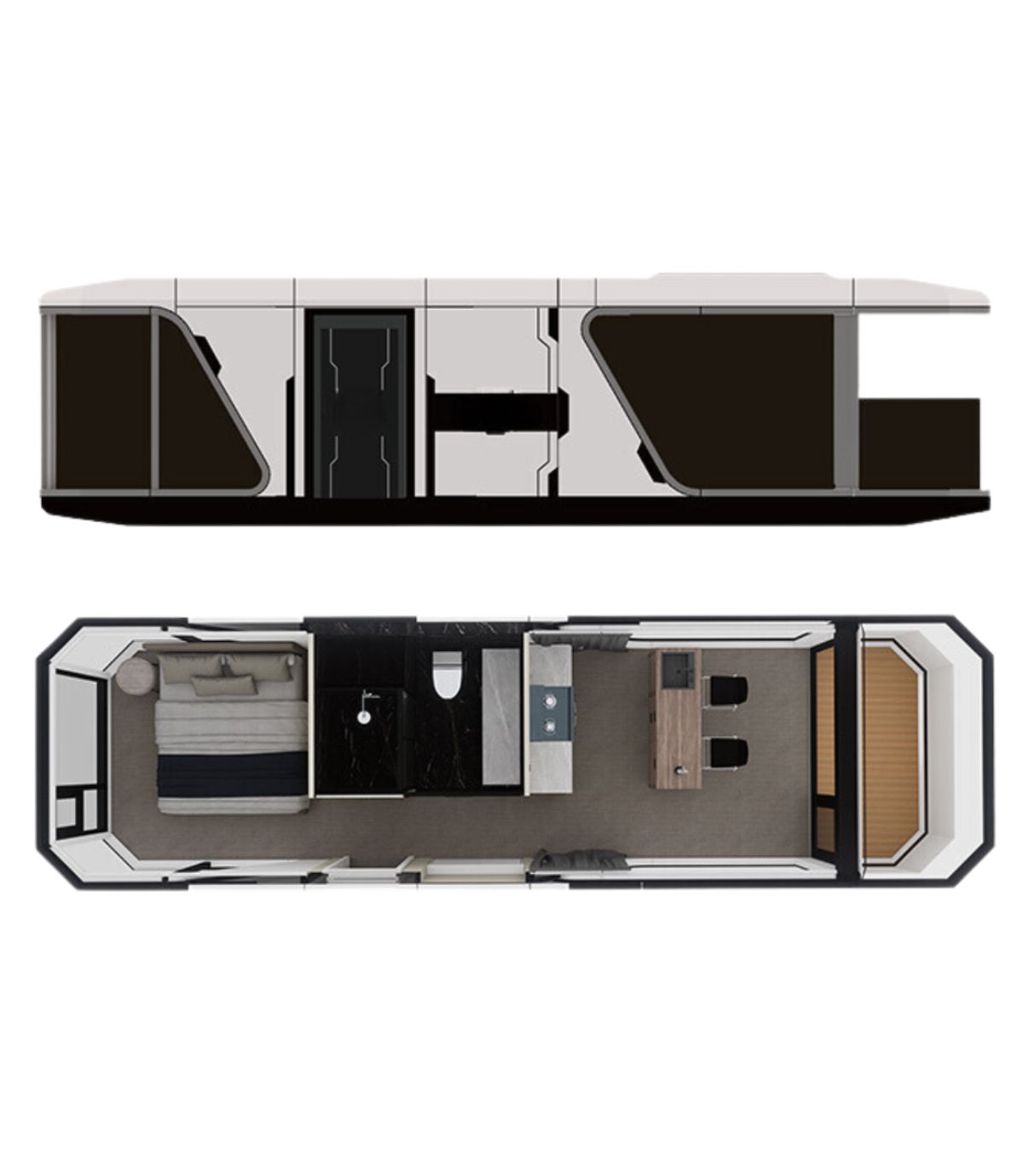 The 40-foot modular dwelling offers an unparalleled living experience, designed with sustainability and versatility in mind. As one steps into this tiny home, a relaxed main lounge zone unfolds, seamlessly merging with an optionally equipped bar entertainment area. The ambiance resonates with the promise of tranquility, making it a haven for those seeking a harmonious connection with the outdoors.