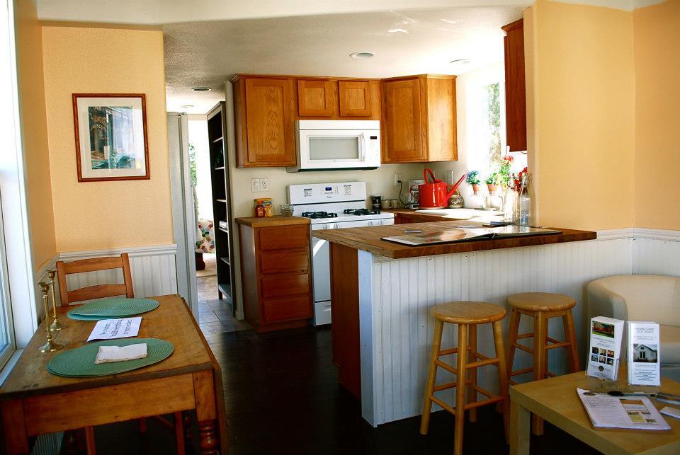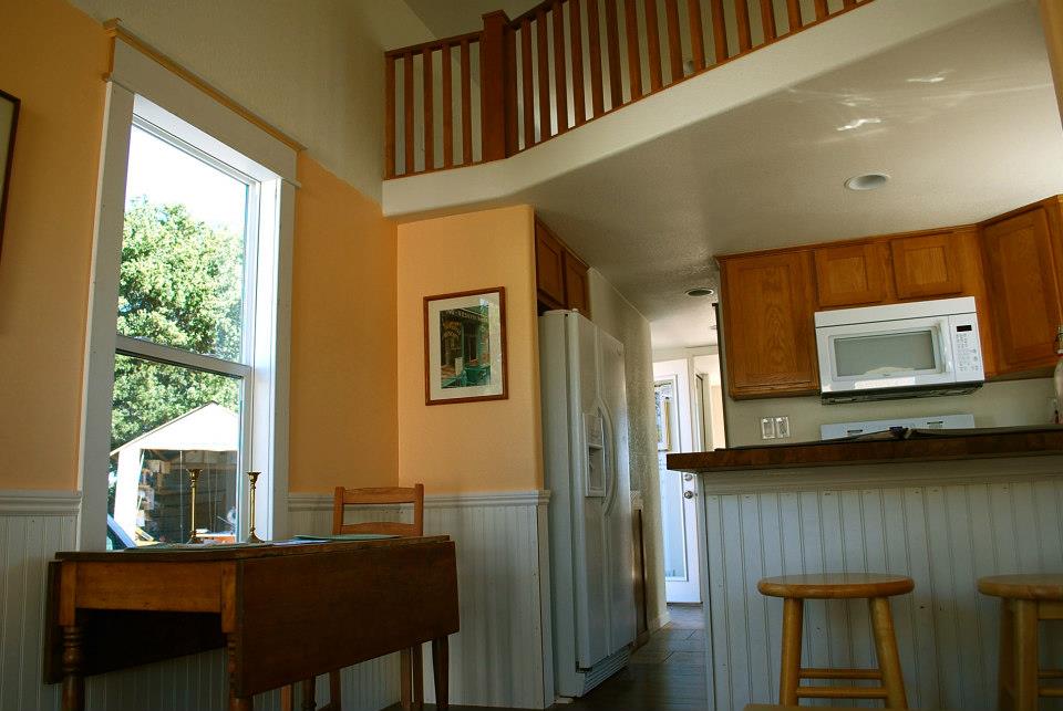 The living room is very chic and commodious. Half of the walls here are ship-lapped and the other half is built in the regular fashion. You can adjust 2 recliner chairs and a small centre table here for your comfort. You will find a compact dining table next to the large window in the great room, which is close to the kitchen. The kitchen does not only fit well in the interior design’s theme but also offers some mind blowing and unique features such as a kitchen island that comes with stools.