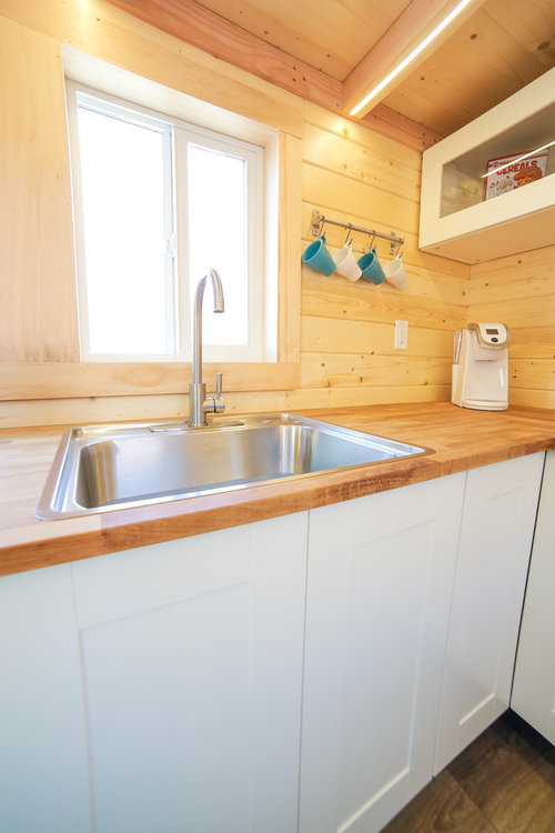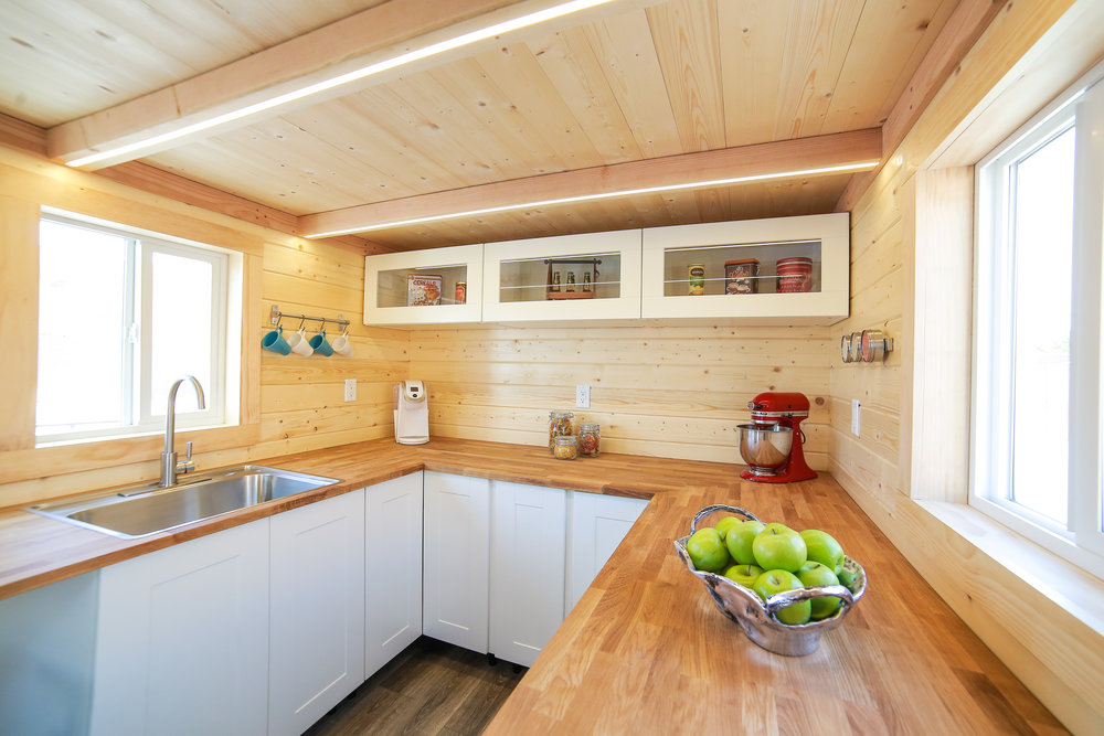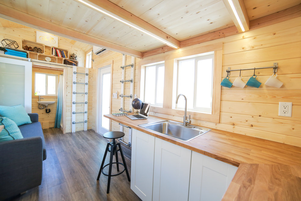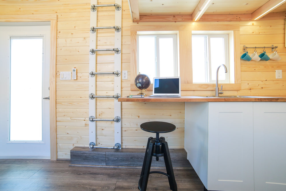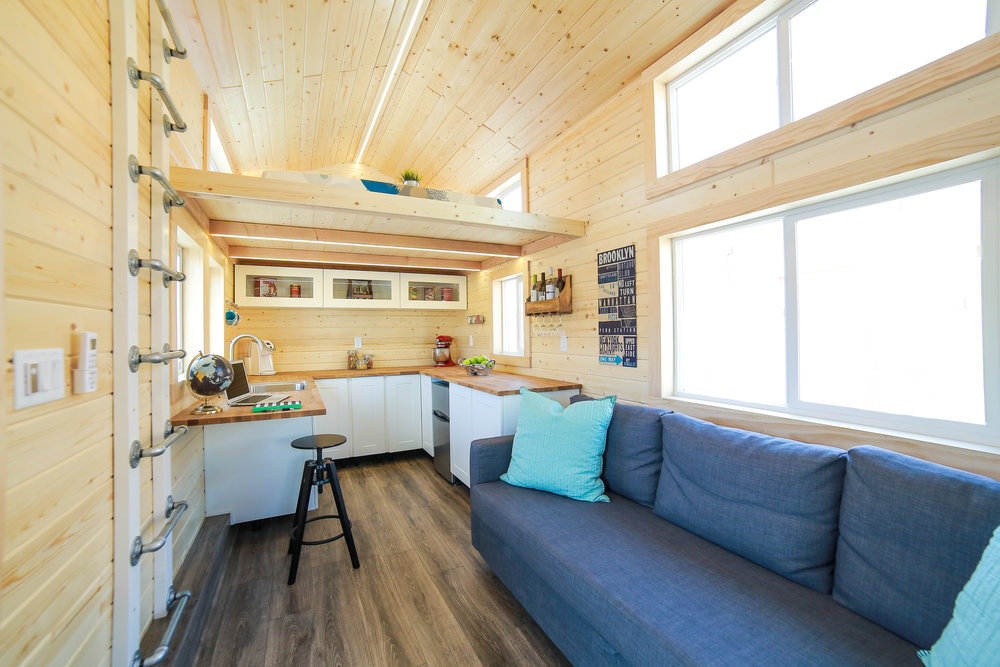 The exterior of this tiny house on wheels is so alluring, thanks to its subtle colour scheme that gives the Mansion Jr. a winsome touch. The beige coloured external lap siding appears super neat while the white coloured frames of the windows really stand out. The darker shade of blue used to coat the roof adds on to the colour scheme and makes the roof look great too. The glass windows not only look lovely but also prove to be a very practical feature. These windows bring in plenty of natural light to keep the indoors well-lit during the day. This way the interiors also appear brighter and more radiant.