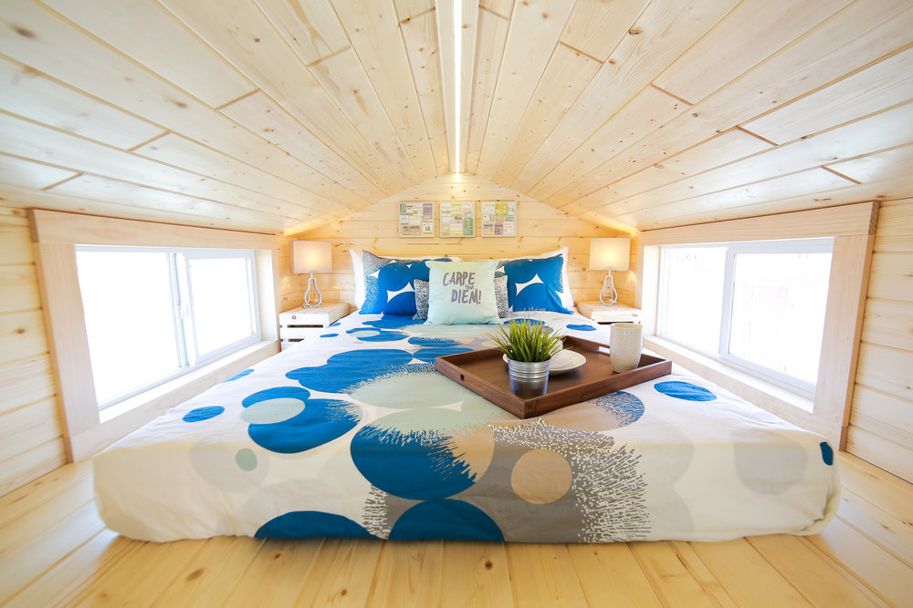 The Mansion Jr. is equipped with everything you need to call this place your home. Lots of windows and natural finished wood gives the tiny house a bright interior. Built with a modern design, it is no less than any modern house. The pop of blue at the entrance gives it all the colour it needs to stand out.