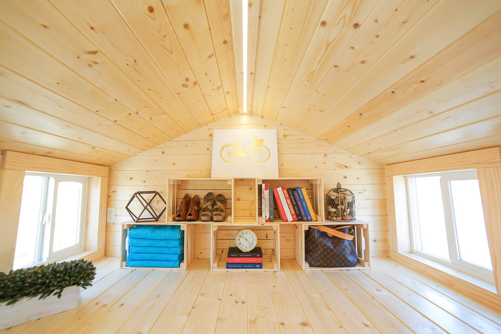 It has a large bedroom loft which can fit a double sized bed easily, and also has a storage loft. Both of which are easily accesible through piped ladders built inside the tiny house.
