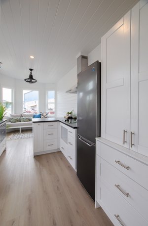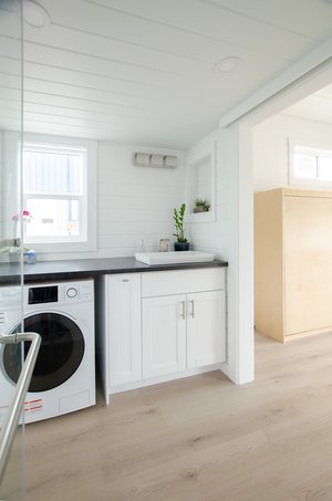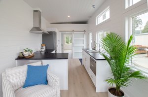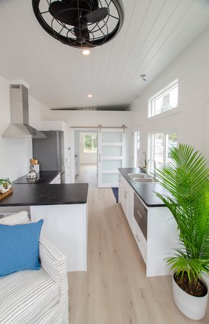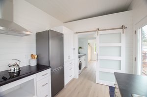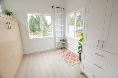 The Mountain Chickadee is a true gem among tiny houses. Its clever design and thoughtful features make it an exceptional choice for those seeking a compact and cozy living space. The abundance of windows floods the interior with natural light, creating a bright and airy atmosphere that defies its small size. The ample cabinet space ensures that you have plenty of storage for all your belongings, helping you keep your living area organized and clutter-free. The cabinet Murphy bed is a space-saving marvel, providing a comfortable sleeping area without sacrificing valuable floor space during the day. The storage loft over the bathroom adds even more functionality, allowing you to keep seldom-used items tucked away but easily accessible. With its charming West Coast-style exterior, this tiny house blends seamlessly with various surroundings. Including appliances like the electric cooktop, on-demand water heater, dishwasher, and full-sized fridge adds convenience and modernity to the living experience. The Mountain Chickadee is a cozy haven that brings together smart design, functionality, and aesthetics, making it an excellent choice for anyone looking to embrace the joys of tiny living.