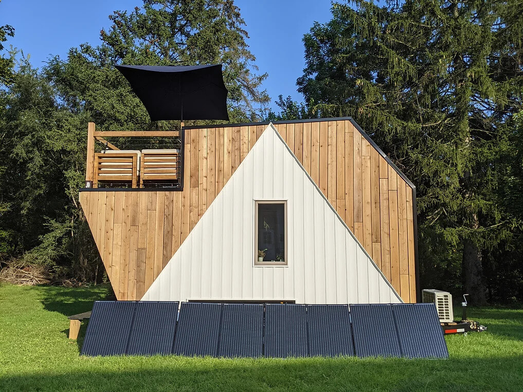 The exterior of the The Mountain XL Off-Grid is designed for energy efficiency, with continuous insulation that minimizes thermal transfer and acts as a barrier against air and vapor. This ensures a comfortable living environment regardless of the climate. The house also has a covered porch that provides protection from the elements, allowing residents to enjoy the outdoors in all weather conditions.