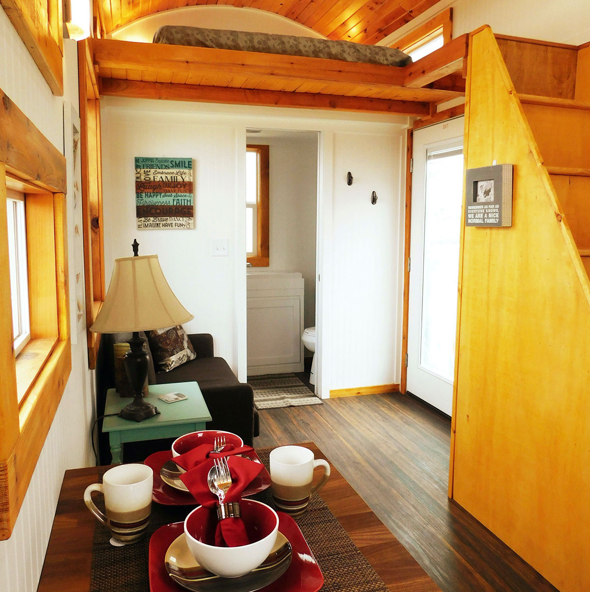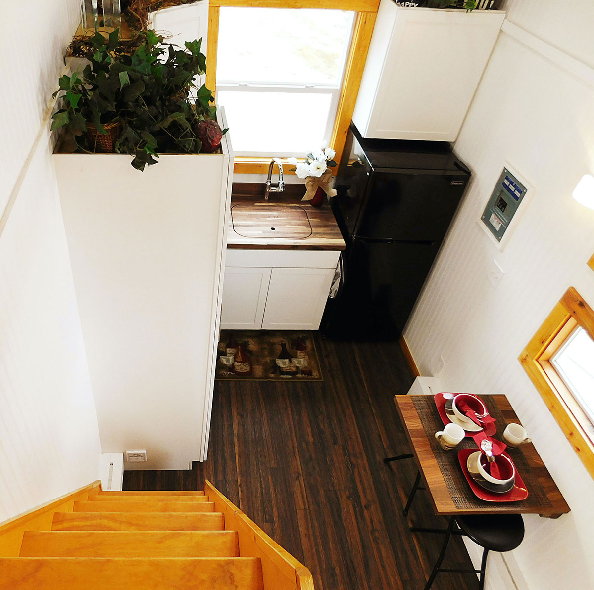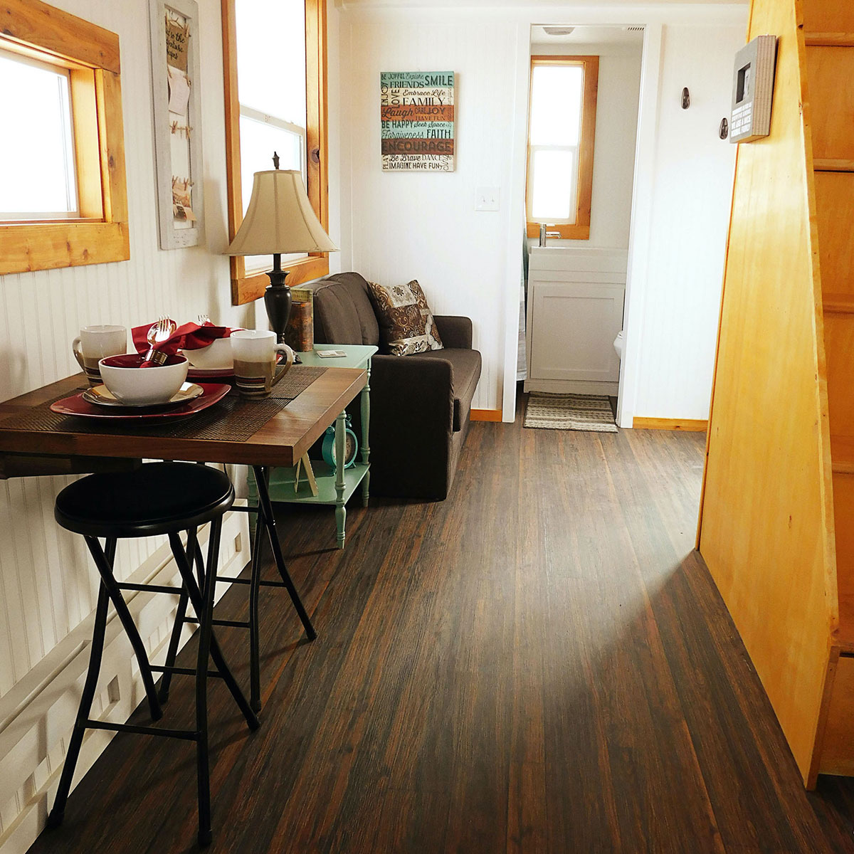 As you ascend the stairs to the sleeping loft, you’ll notice a clever feature: a 42-inch base staircase that ingeniously doubles as a storage area. A closet rod for hanging clothes and a door at the back of the stairs make this a multifunctional feature. It’s a testament to Tiny Idahomes' exceptional design strategy, placing every square inch into purposeful use.