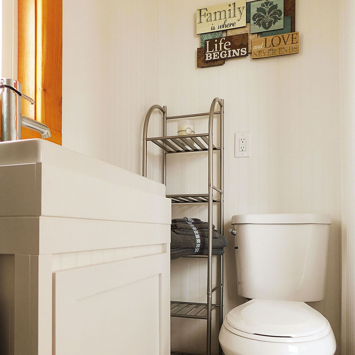 Venturing forward, you will find the front bathroom – a brilliant example of space utilization. Deceptively roomy, it is designed to even accommodate a jetted tub, a luxury rarely seen in tiny homes. This bathroom is a sanctuary where you can unwind in comfort, all within the confines of the Pioneer.