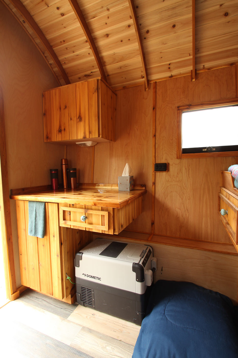 A sturdy corner table with an in-built drawer and an additional mini closed cabinet affixed in the wall atop only add on to the long list of perks. A fold down table is available and you can put two tiny chairs on each side of it to make use of it as a makeshift dining table. The main attraction point of the Shimza is its source of power that happens to be solar charged, manifesting as an eco-friendly camper that does not contribute towards any form of pollution.