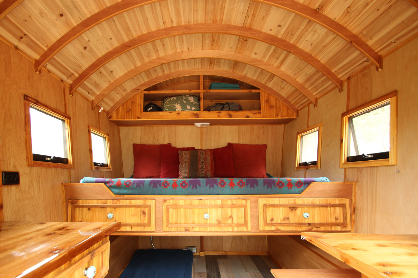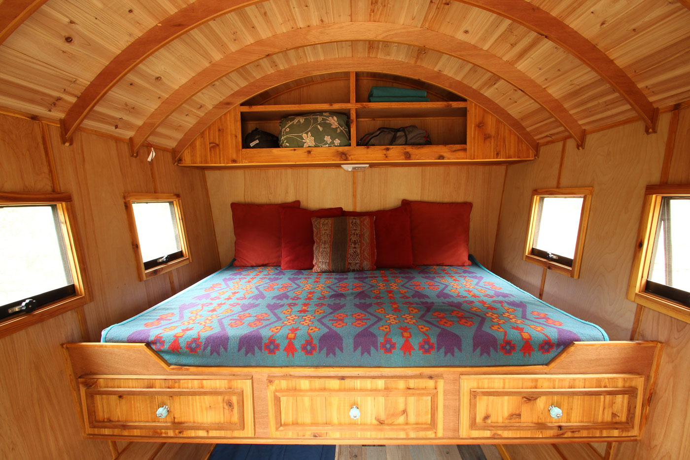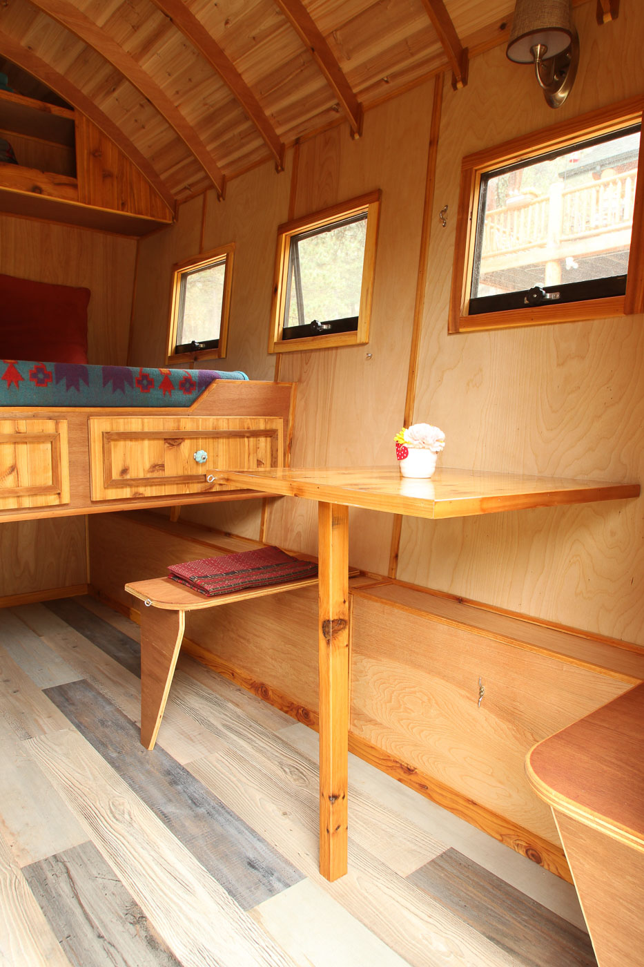 Weighing at a total of 2400 lbs, the Shimza is appropriately lightweight according to its size and the dimensions are set at 5’ x 10’. It covers 50 square feet of area and can be conveniently towed with a compact car. The wooden wainscoting with a splash of striking turquoise together makes the exterior appear gorgeous and gleaming. The miniature wall mounted outdoor lights along with the classic curved Dutch door provide an insight into the meticulous design plan that aims to provide utility enmeshed with style.