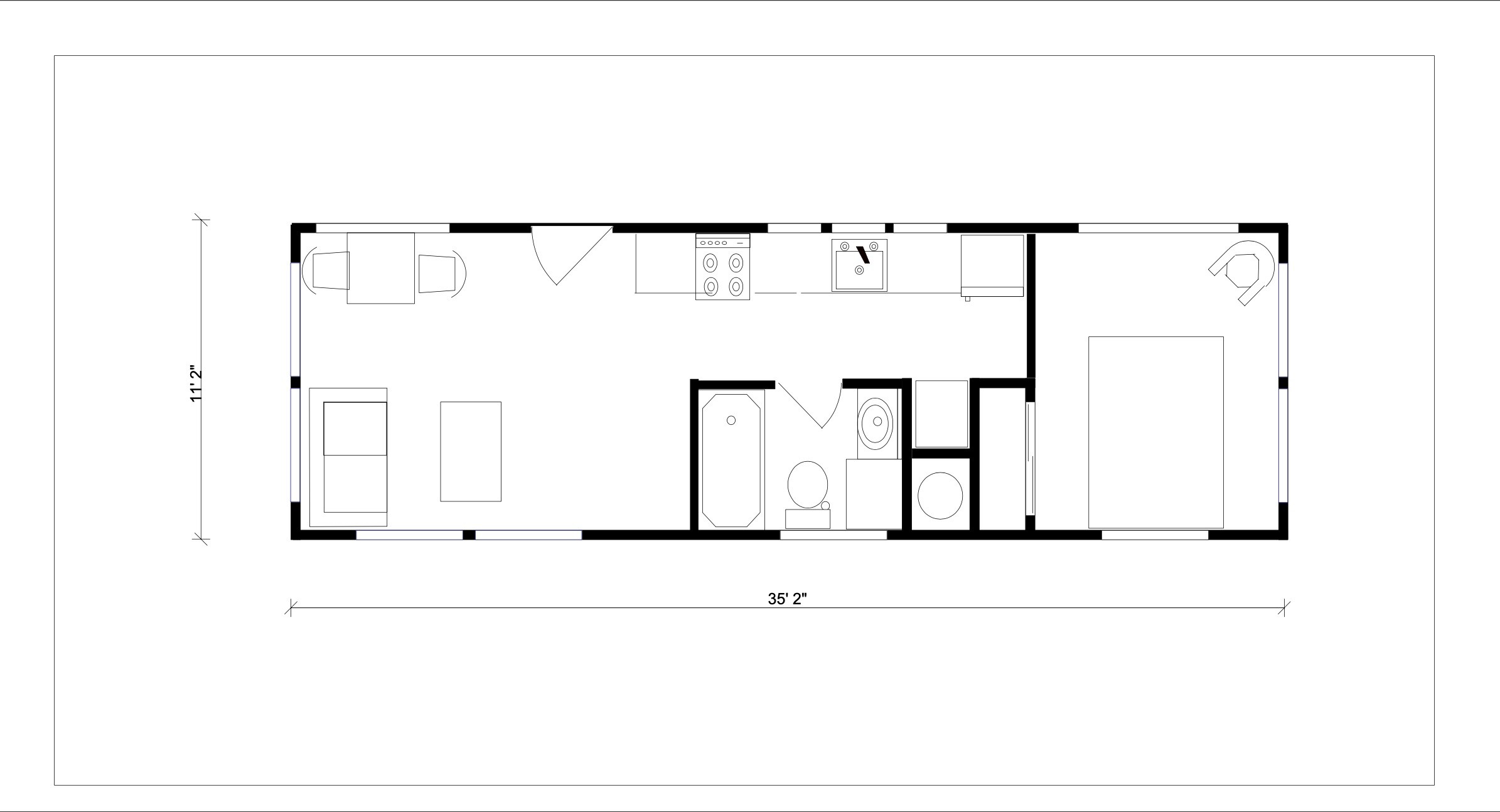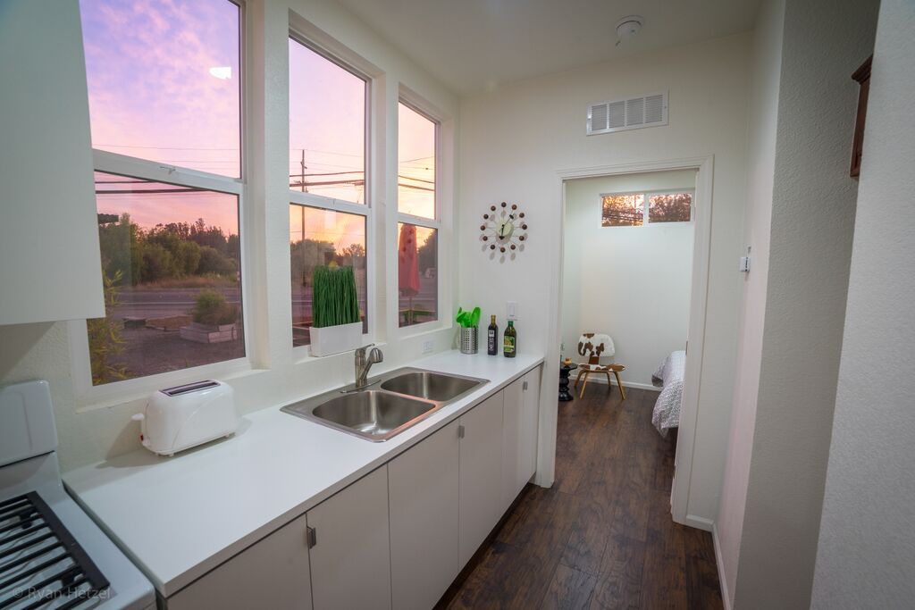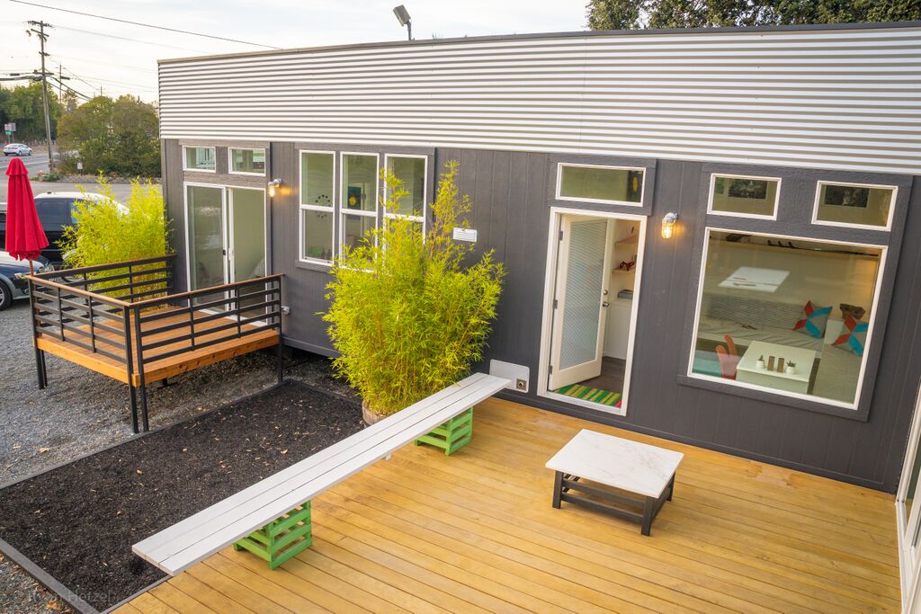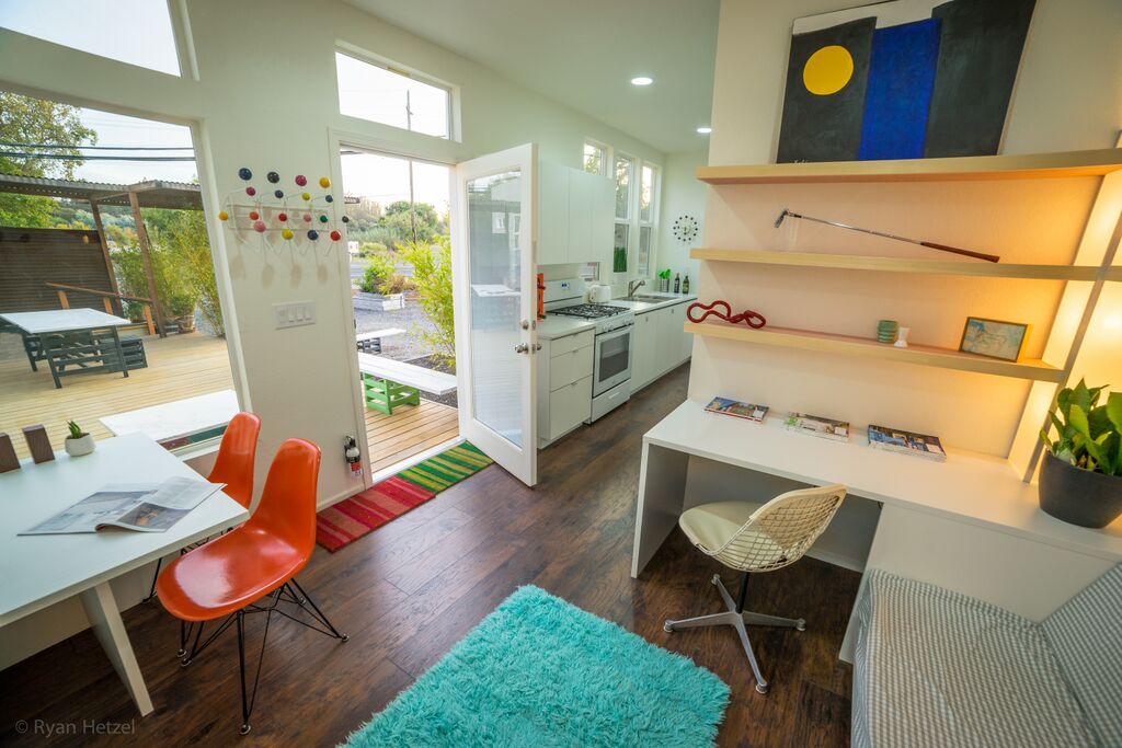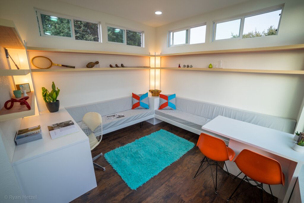 There are two sconce lights affixed on the wall that aid in keeping the outdoor lounging area illuminated in the evening. The great room in the interior comes with a sturdy table and chairs combination that can be used as either a dining table or a study desk. The entire house is pristine white on the inside and based on that it looks very clean and commodious. The living room has a work desk in-built for your convenience and it also bears 3 tiers of open shelves that can be used to stack books, photo frames or showpieces.