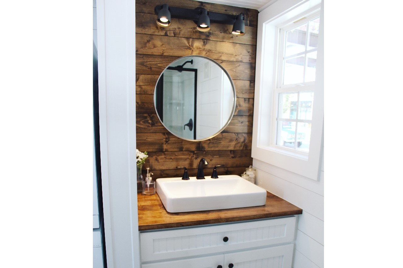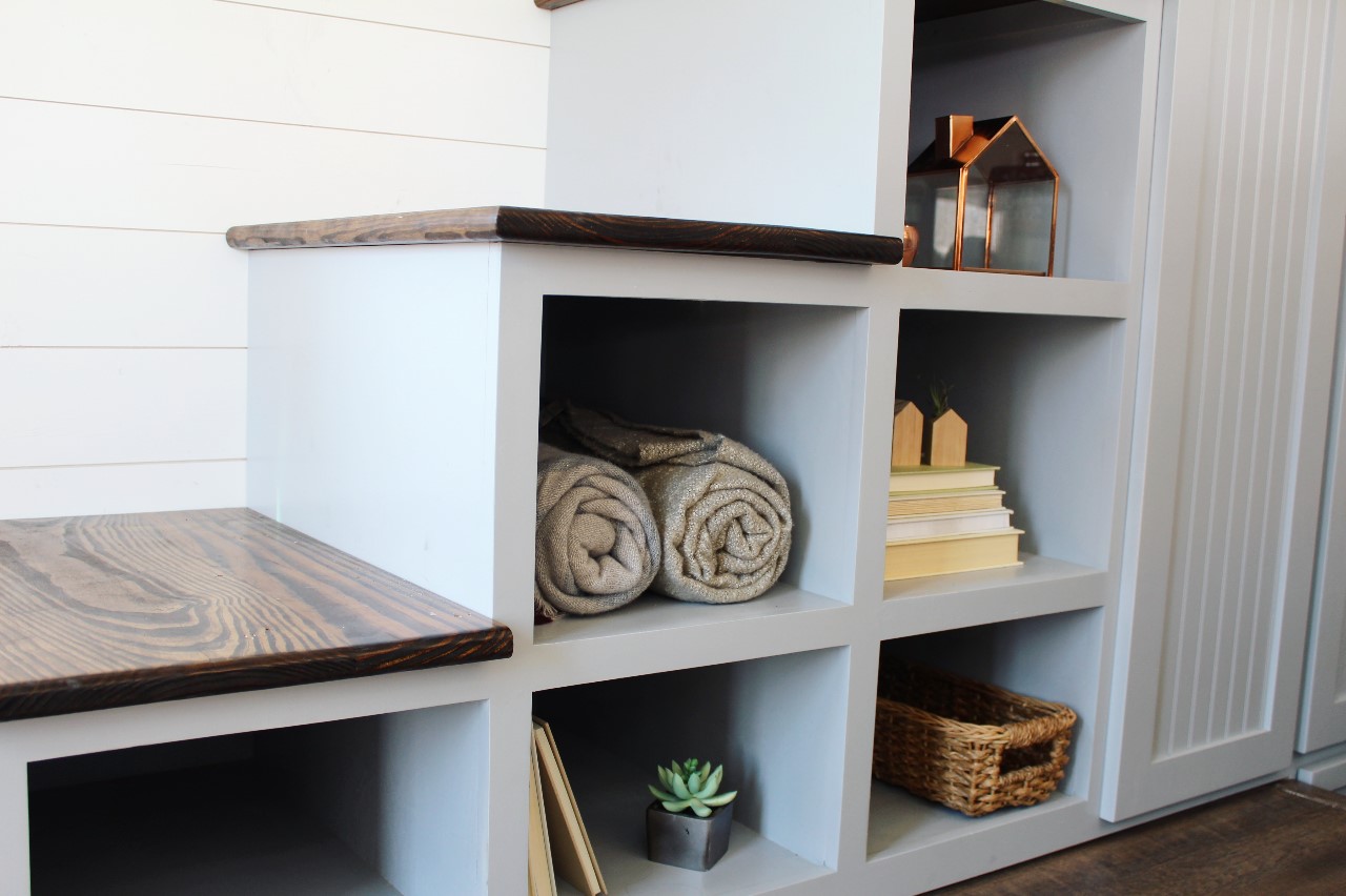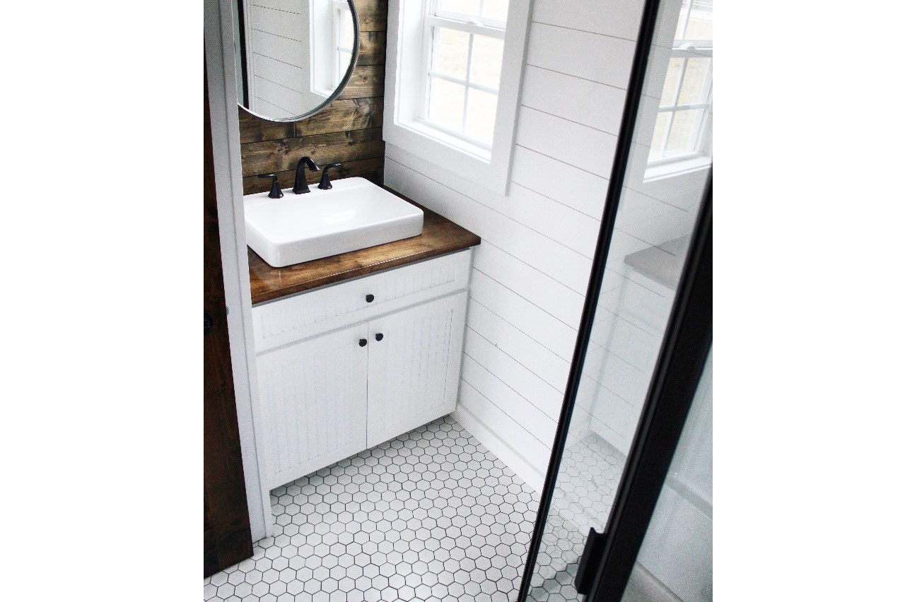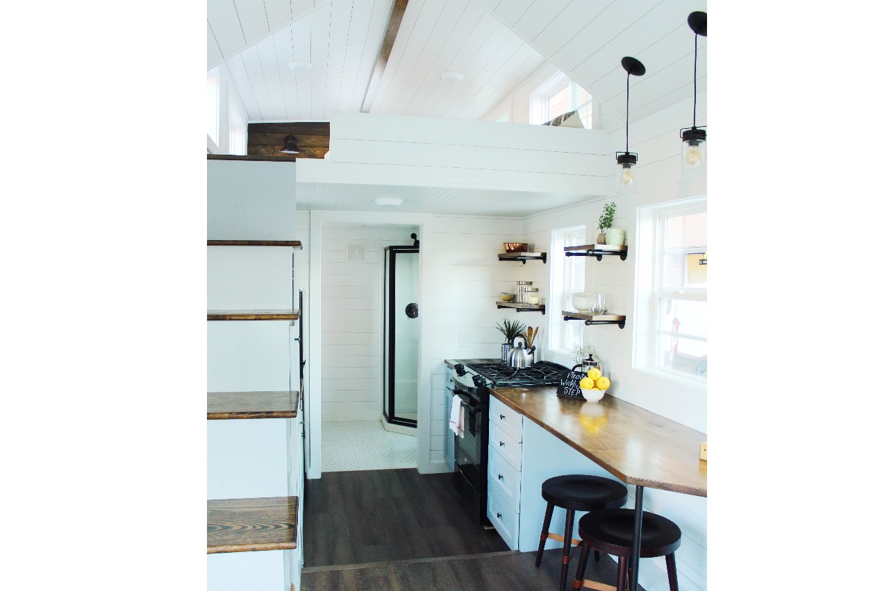 The great room is not very expansive but can surely hold a comfortable loveseat while still leaving plenty of elbow room. The house has in-built side tables affixed in the two corners of the living room. The kitchen counter has a wooden finish top and it is paired with the open shelves affixed in the wall which together make the kitchen attain a chic look. The big block stairs lead you up to the bedroom loft which is really spacious and can conveniently sleep up to two people. The bathroom is just as great as the rest of the house and holds a very pretty vanity combination along with a shower pan that has glass doors surrounding it on all 3 sides.