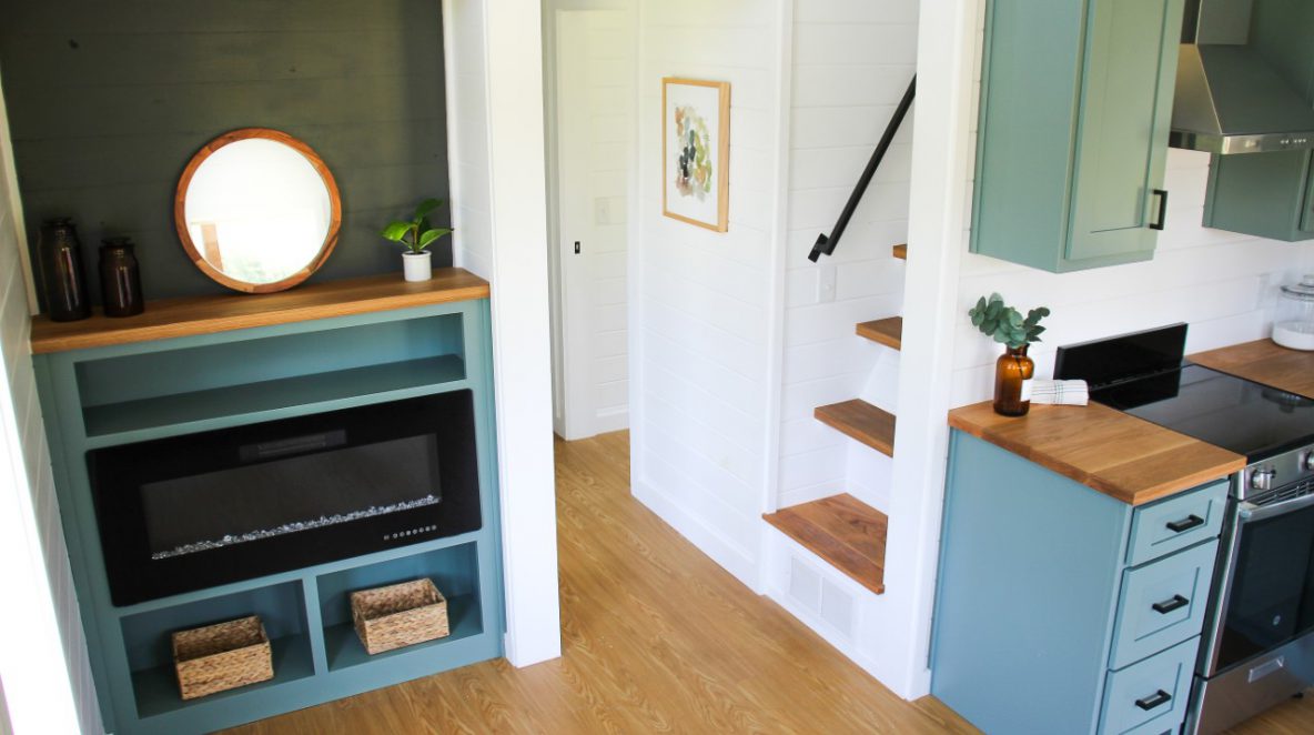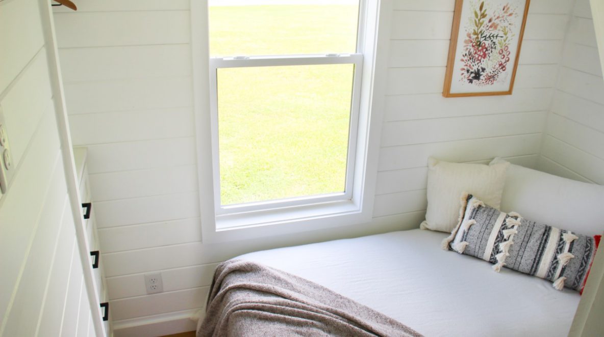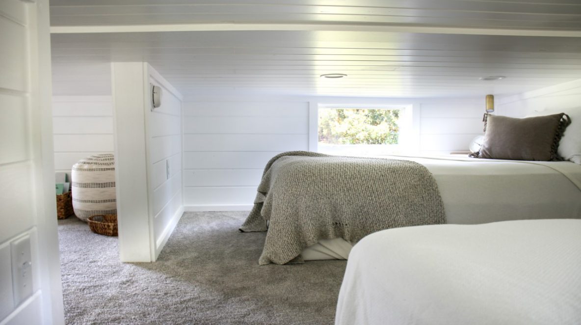 You get a stainless steel sink, a 4 burner gas stove with oven combination and a stainless steel fridge placed below the cabinet in the living room. The in-built stairs lead you up to the bedroom and bathroom which are both really spacious and stylish. The white shiplap walls make the entire space appear bigger and brighter and the bedroom can sleep up to two people comfortably. The bathroom is clean looking with a very pretty vanity combination, a standard toilet and a tiled shower that complete the look.