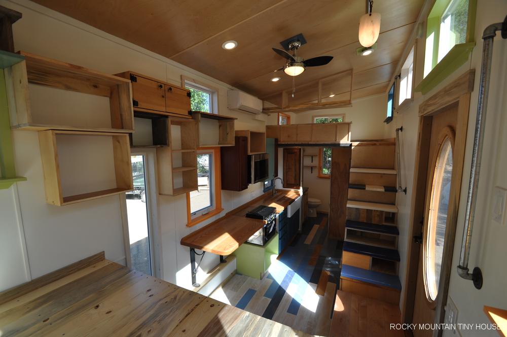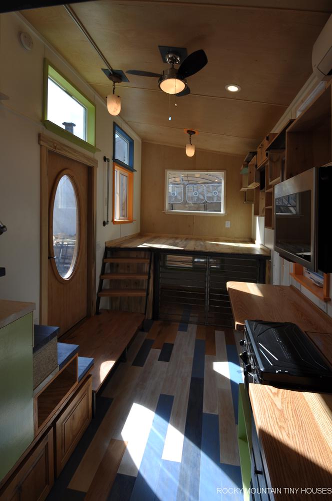 The best part about this house is its structure and windows. One gets a lot of fresh ventilation through the windows and it is an affordable option for a lot of people out there. One can enter the house by an oak wood door that features an oval glass in the middle of it. You can also cover the oval glass on the main door with curtains for privacy. As you enter on the left you see stairs the lead to the upper part of this tiny house and then the kitchen. There is plenty of space in living area for furniture, so you get the chance to decorate it according to your wants