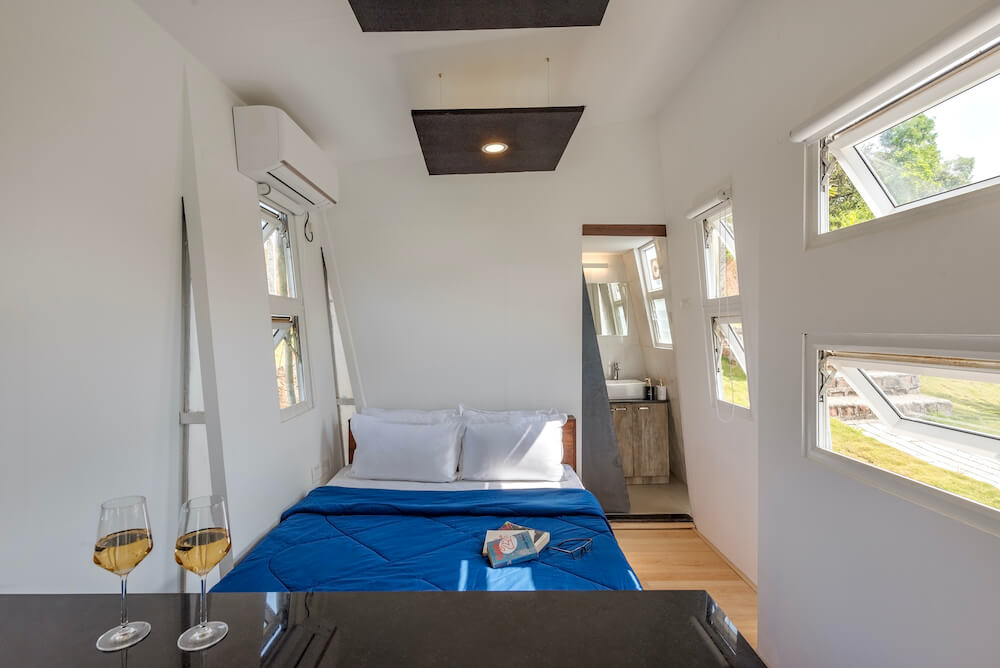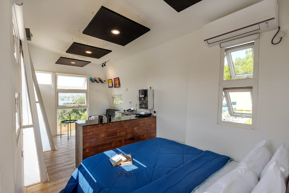 The Twist is as unique as it's name. The functionality and layout of the home seems unaffected by the unique architectural design, which is a huge plus for livability and comfort – it's also key to getting good reviews from your nightly rental stays if you're renting it out. The nature of it's design, it seems very low maintenance, it has enough windows to allow for cross ventilation and the kitchenette will suit most of your cooking needs.