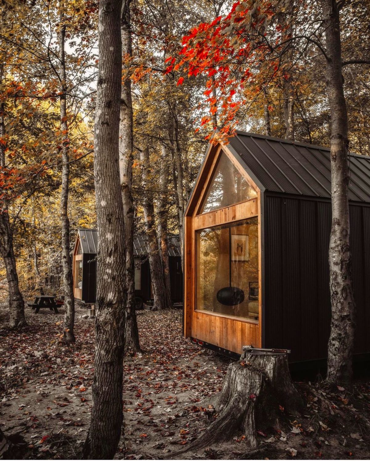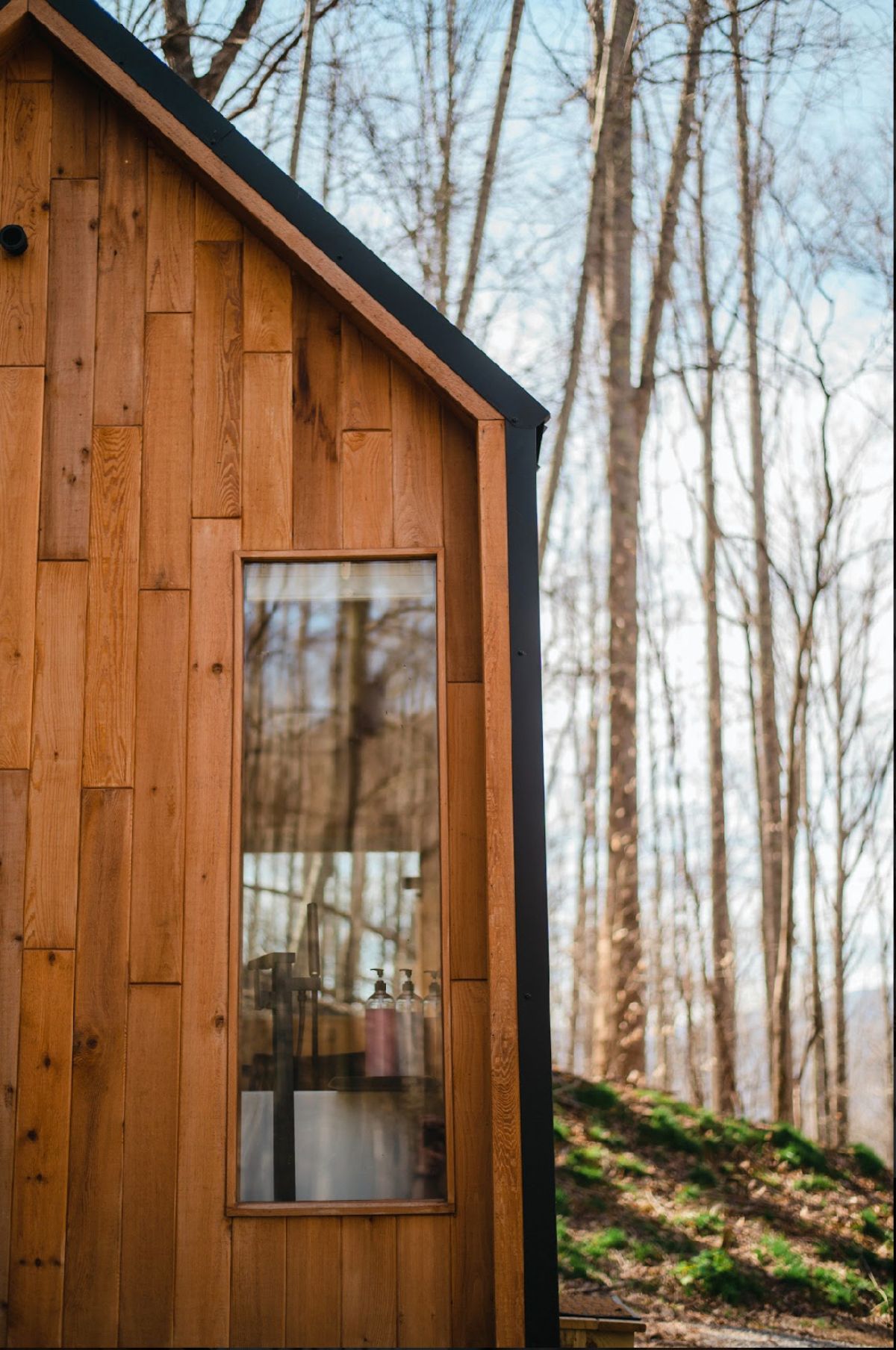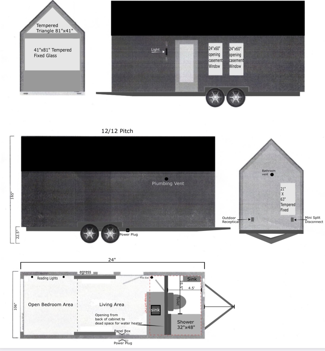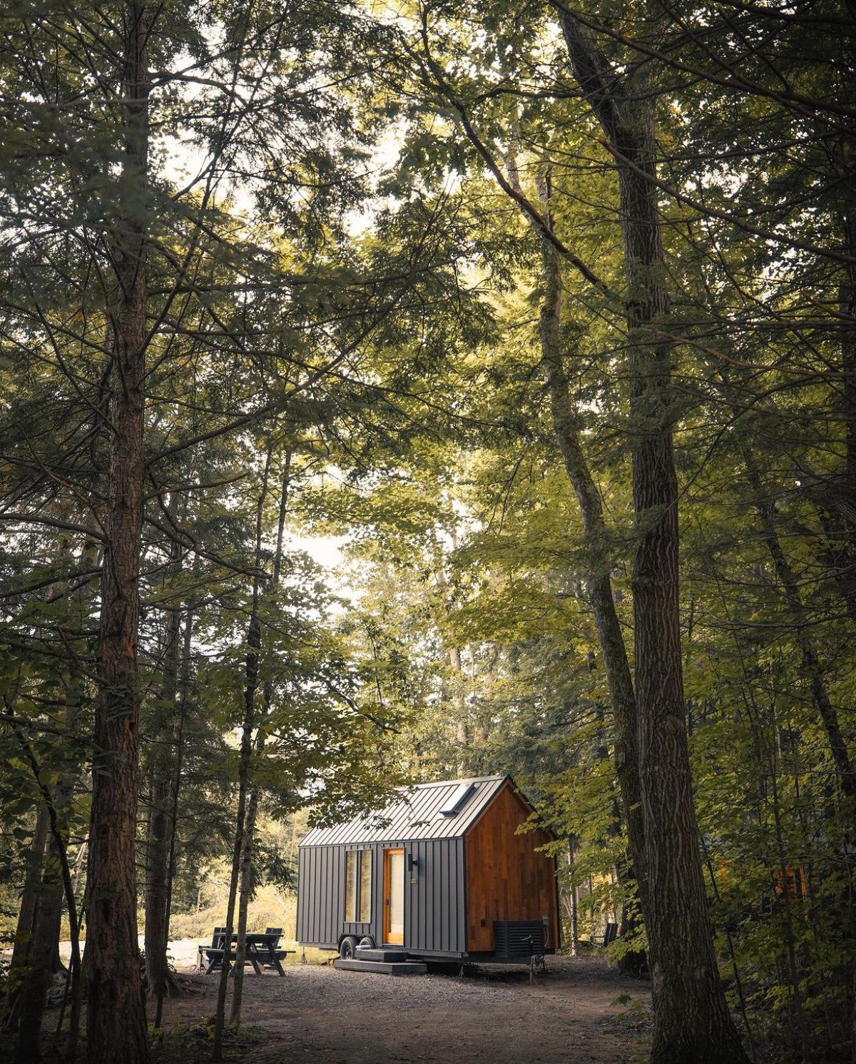 The end wall stands out subtly with the vertical T&G with a big picture frame window that looks to frame the great outdoors. Space to put your main bed or convertible couch makes it feel larger than it is, while still giving you space for a couch and dinette table.