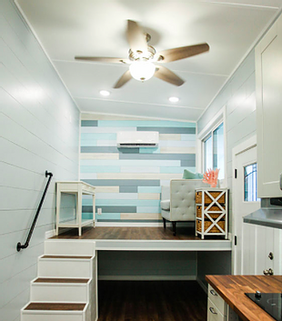 The living area is big enough to accommodate an average couch and a small side table. The ceiling holds lights and a fan for added utility and the flooring is done with stunning wood grain waterproof vinyl. The Bree has a stylish kitchen that is equipped with fashionable stainless steel appliances to offer practicality enmeshed with style. A farm sink and spacious storage cabinets that have been customised to look great while fulfilling its purpose. The bedroom loft has a hand railing near the stairs to ensure safety and the loft has sufficient space for storing your stuff. The bathroom has a tiled bathtub, a flush toilet, a 20 gallon water-heater, a large closet and an LG washer dryer combo.