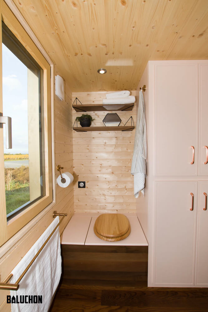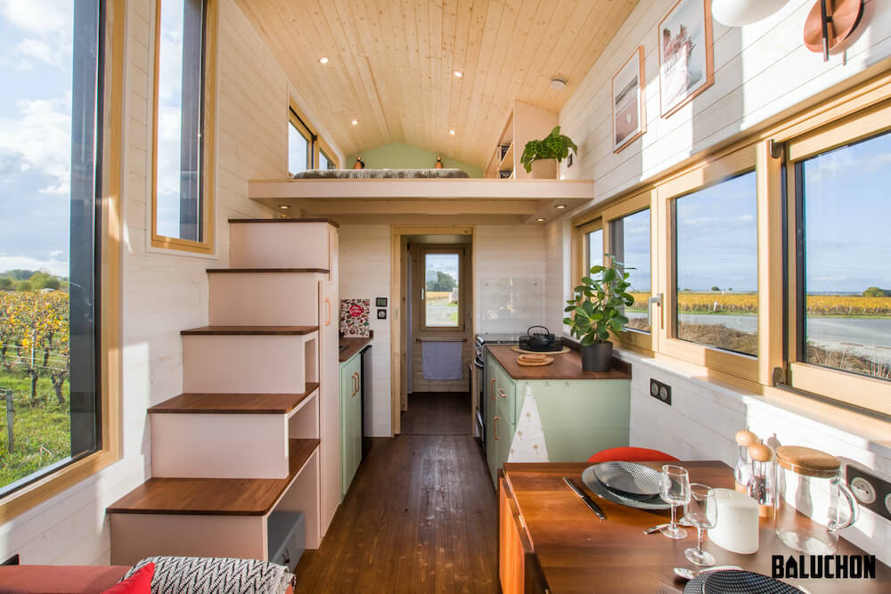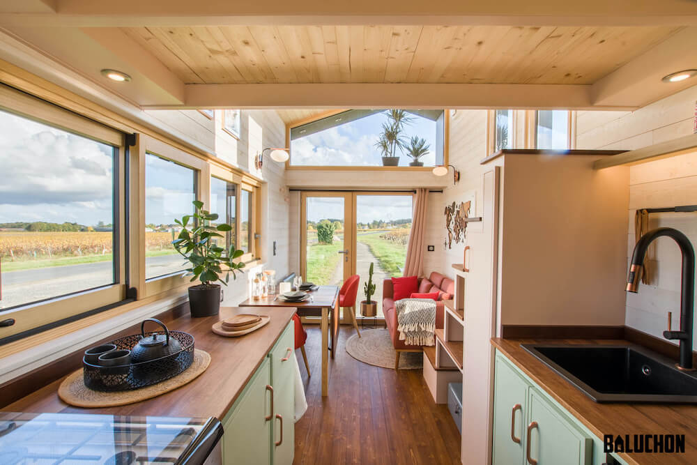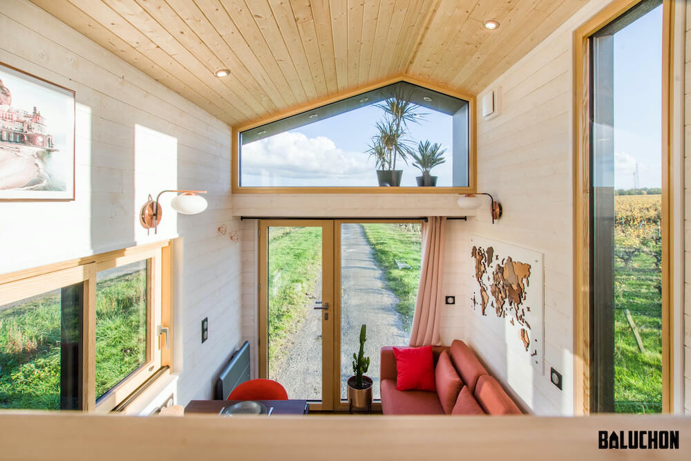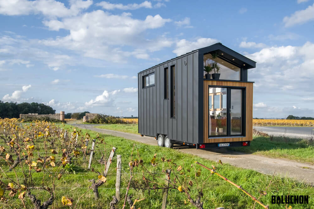 Ala Köl, a stunning European Tiny House displays a resolutely contemporary architecture. Its off-center ridge, the facade entirely dressed in black aluminum, the large joinery and the skeleton cladding give it a clean and modern look while maintaining a homey feel.