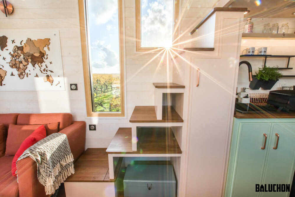 Finally, a staircase with several storage spaces allows you to go up to the mezzanine loft bedroom. You'll find plenty of large storage spaces, opening window for fresh air, and enough room to fit a queen size bed.