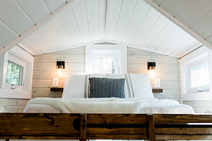In terms of the interior design, this house performs exceedingly well. Upon closing the barn door of the washroom, you are greeted with a full in-built book case that is placed to provide extra storage space for you to not just stack your books but also other showpieces to enhance the beauty of the interiors. The bedroom comes with a full size bed that can sleep up to two people along with in-built shelves in the loft that make living in this trailer more convenient.