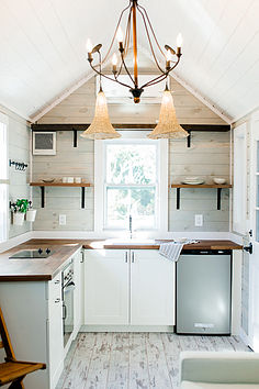 The gable roof of the main house along with a slightly less slanted roof of the bedroom loft is made up of metal that simply slides off the rainwater, preventing any leaks or damage. The 24 feet long trailer is spacious and has open interiors. You can stack the outdoor unit of the air conditioner on the rear end of the trailer. The pristine white interior theme is so immaculate, it’ll take your breath away. The modular style and chic interior décor only add on to the already spick and span looking house.