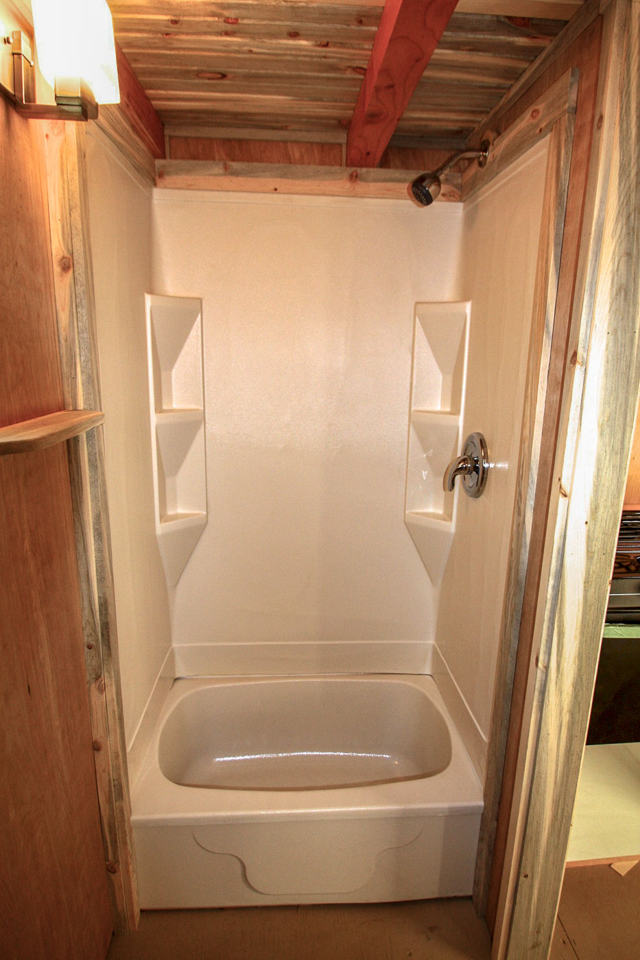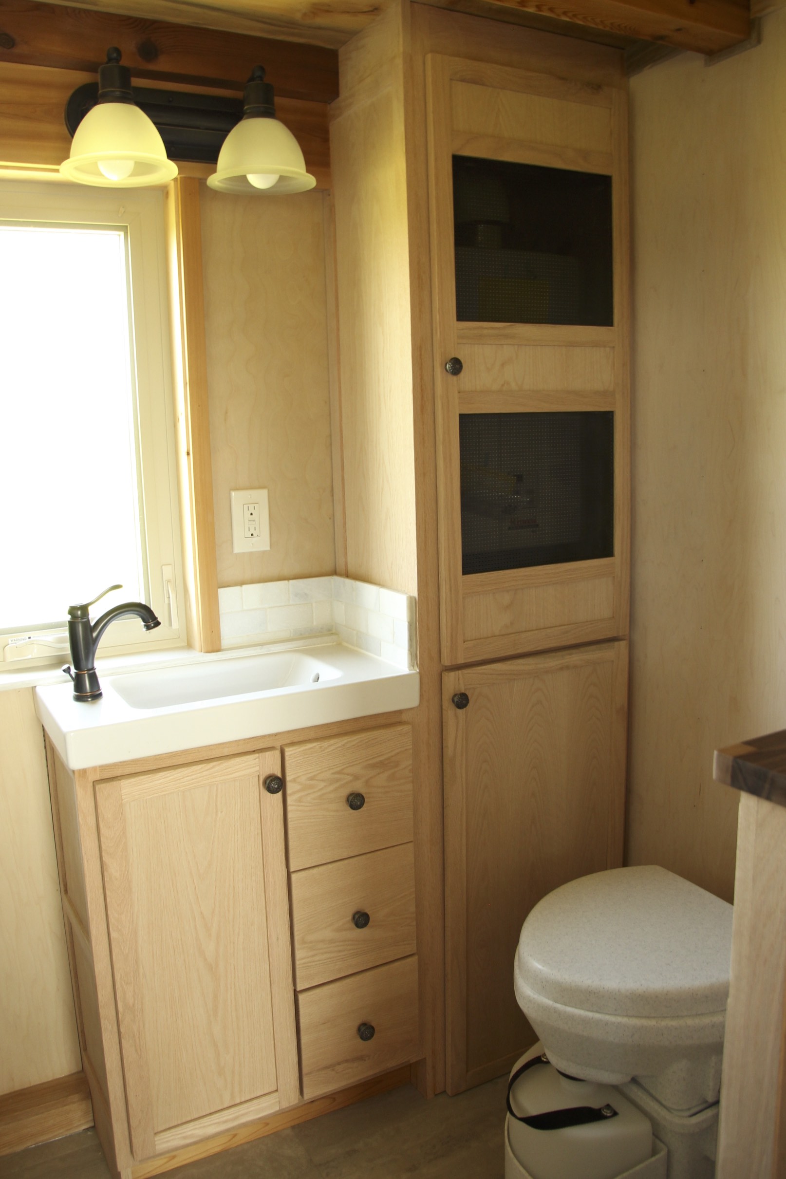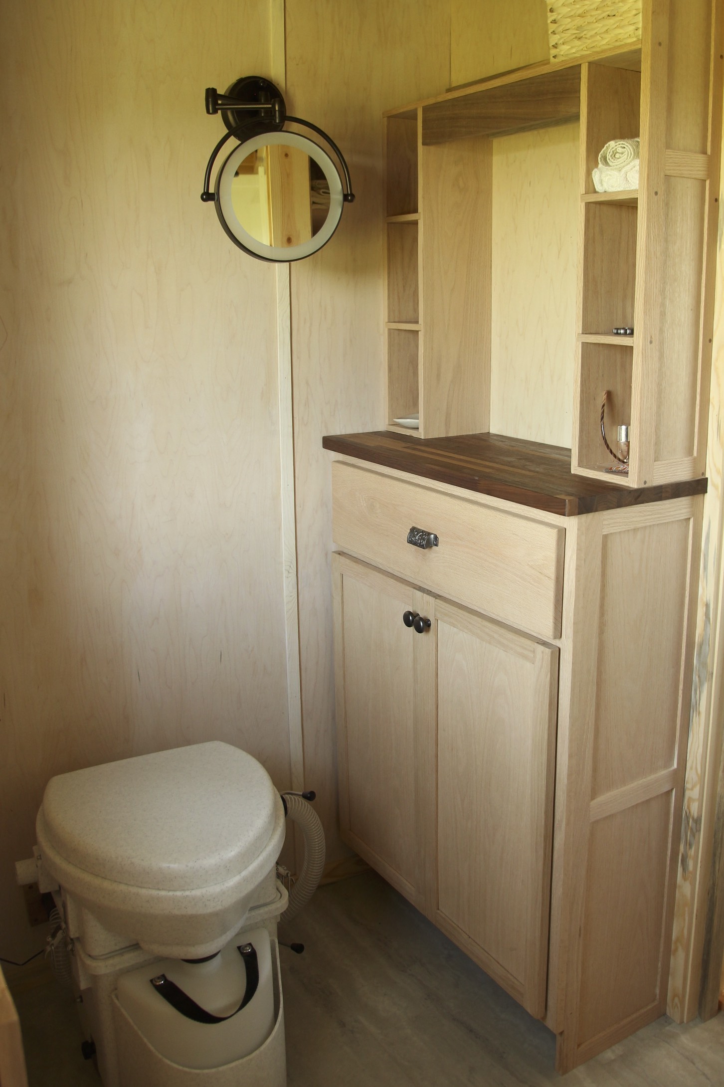The custom oak makeup vanity and bathroom cabinet allow you to enjoy extra storage while the standard washbasin and faucet adequately fulfil the purpose. A Rinnai propane water heater, a shower pan and a nature’s head composting toilet complete the washroom.
