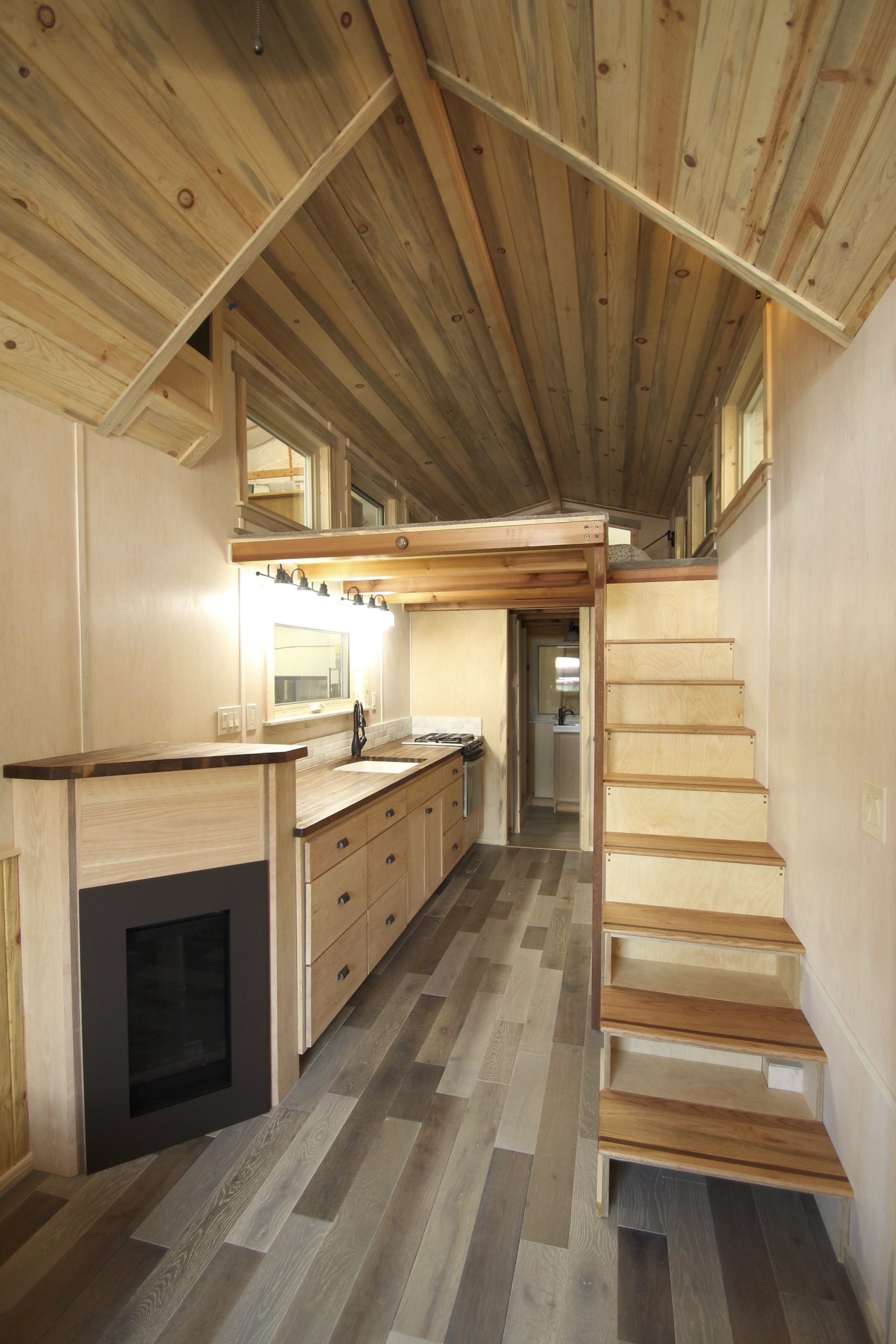The meticulous attention to designing and detailing can be easily detected by looking at the external elements that alleviate not just the exterior but the overall charm of the Tiny OM. The dual styled sloping roofs are made from pro panel II metal which make the house look good while simultaneously increasing its durability. You’ll find a hint of the same material used in the exterior lap siding along with horizontal cedar tongue and groove planks.