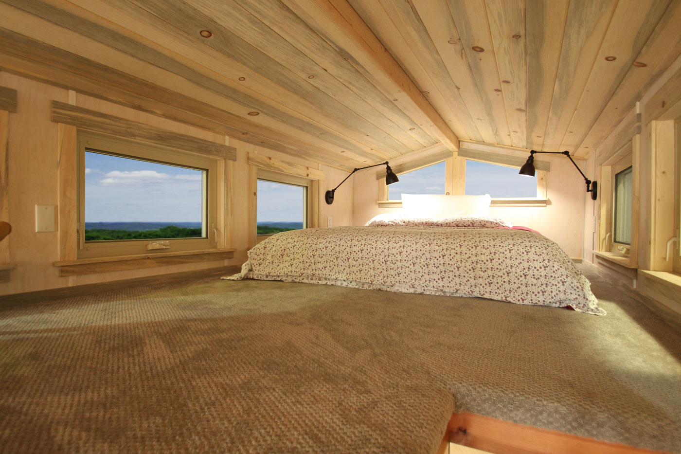 The bedroom loft is commodious and comfortable for sleeping up to 4 members. A queen-sized mattress can be placed here along with other pieces of furniture such as a small dresser or a modest cabinet. The living room has a built-in U-shaped seating platform with cushioned pads lined along with the three big windows on each wall that illuminate the entire area. The Kozy Heat Propane fireplace in the corner keeps the place warm and even has a flat wooden top for keeping house plants or showpieces.