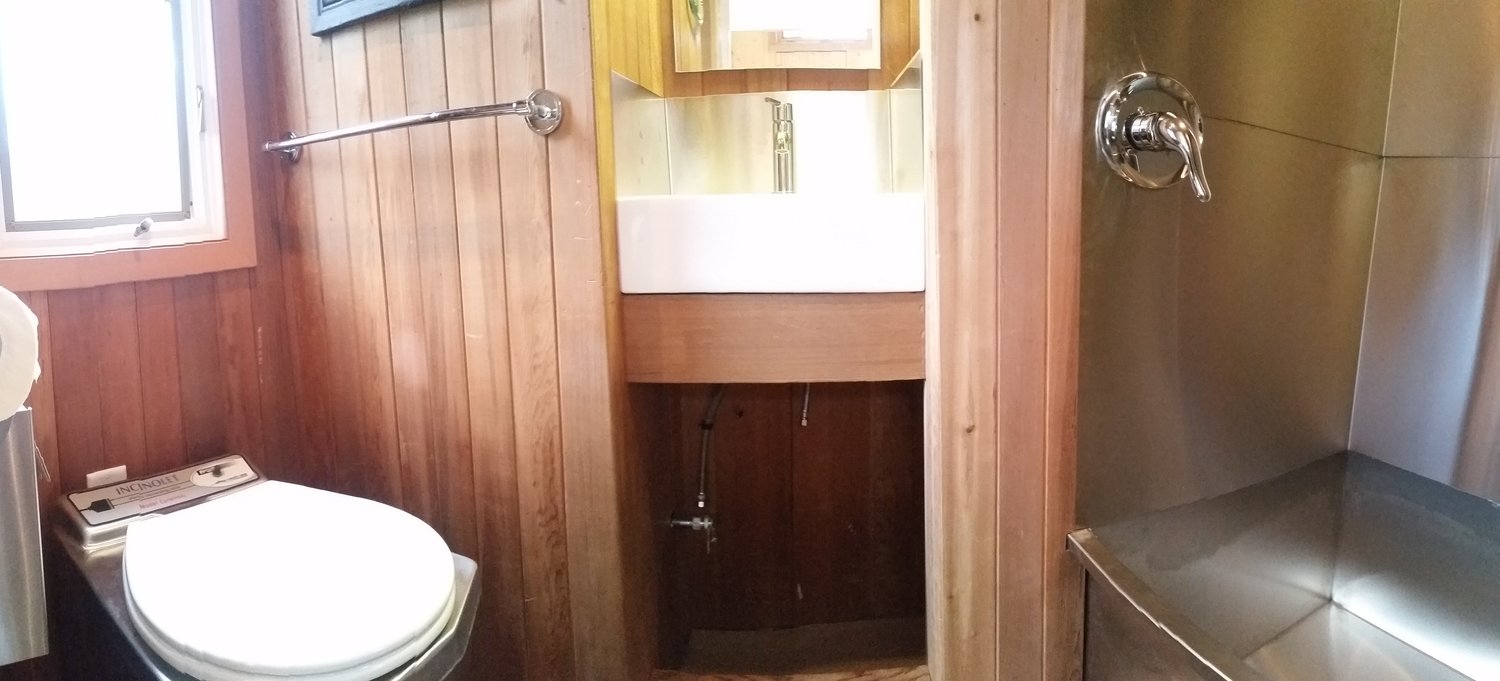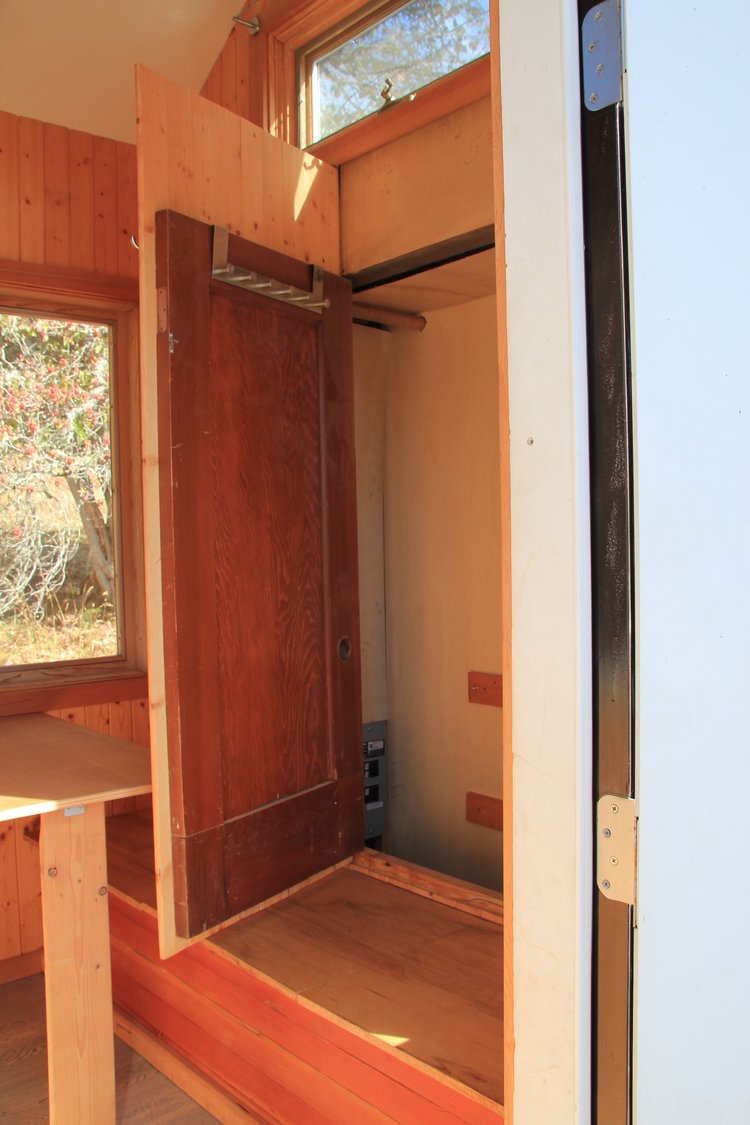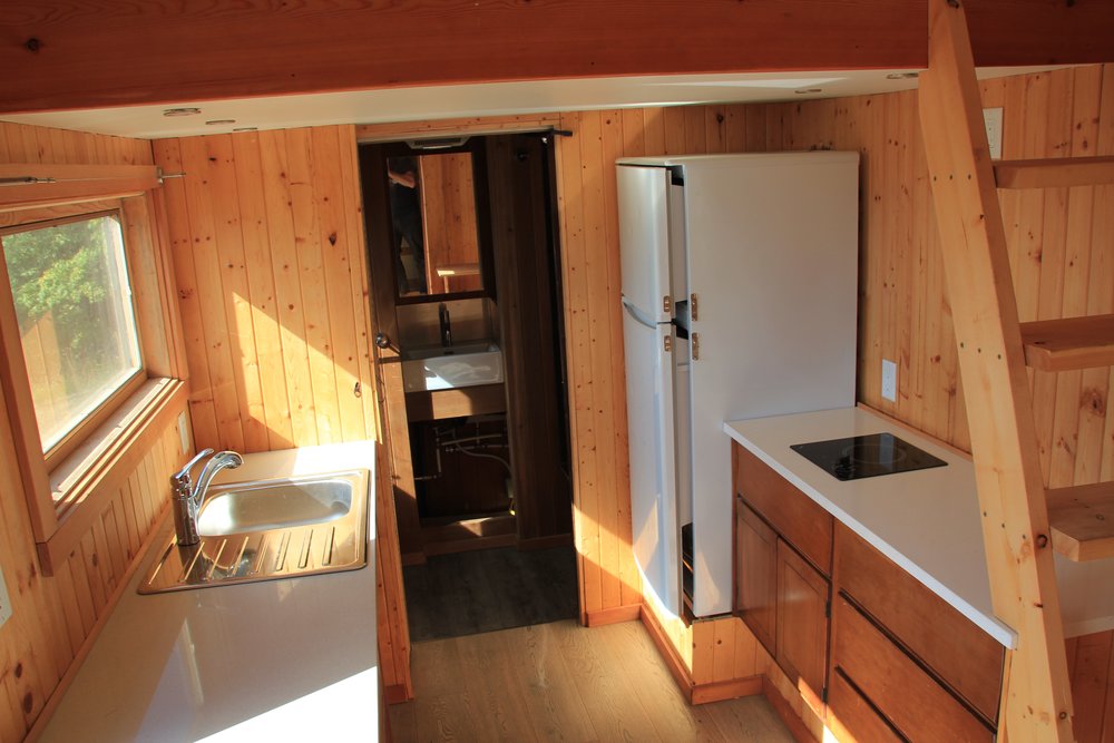 The galley kitchen is quite spacious and comes bearing all the required appliances and features. Both the kitchen counters have sleek white granite countertops that elevate the kitchen’s look. The kitchen cabinets are repurposed and hand made from vintage American Cherry wood furniture and look very modish while providing sufficient storage space to the residents for keeping cookware and other items. There is a stainless steel sink with an attached faucet inset in one counter along with a tiny dishwasher underneath it whereas the other counter holds a propane hot water tank with an induction cooktop. An apartment sized refrigerator is also placed here to complete the kitchen’s look.