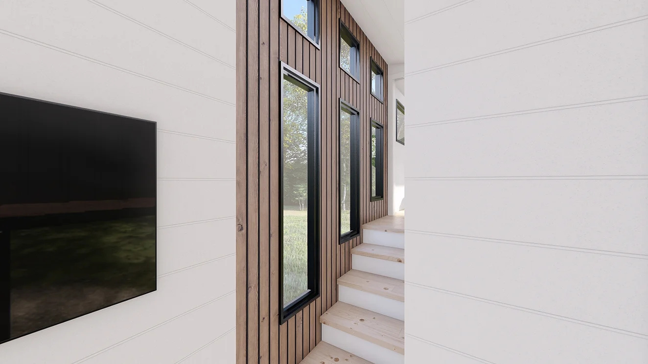 Emphasizing energy efficiency, the True North Retreat boasts 19 triple-glazed windows, a classic craftsman front door, and a 5' wide, full-glass patio door for additional access. The exterior showcases stylish faux stone and metal siding with roofing designed for a remarkable 50-year lifespan, ensuring a lasting and maintenance-free aesthetic.