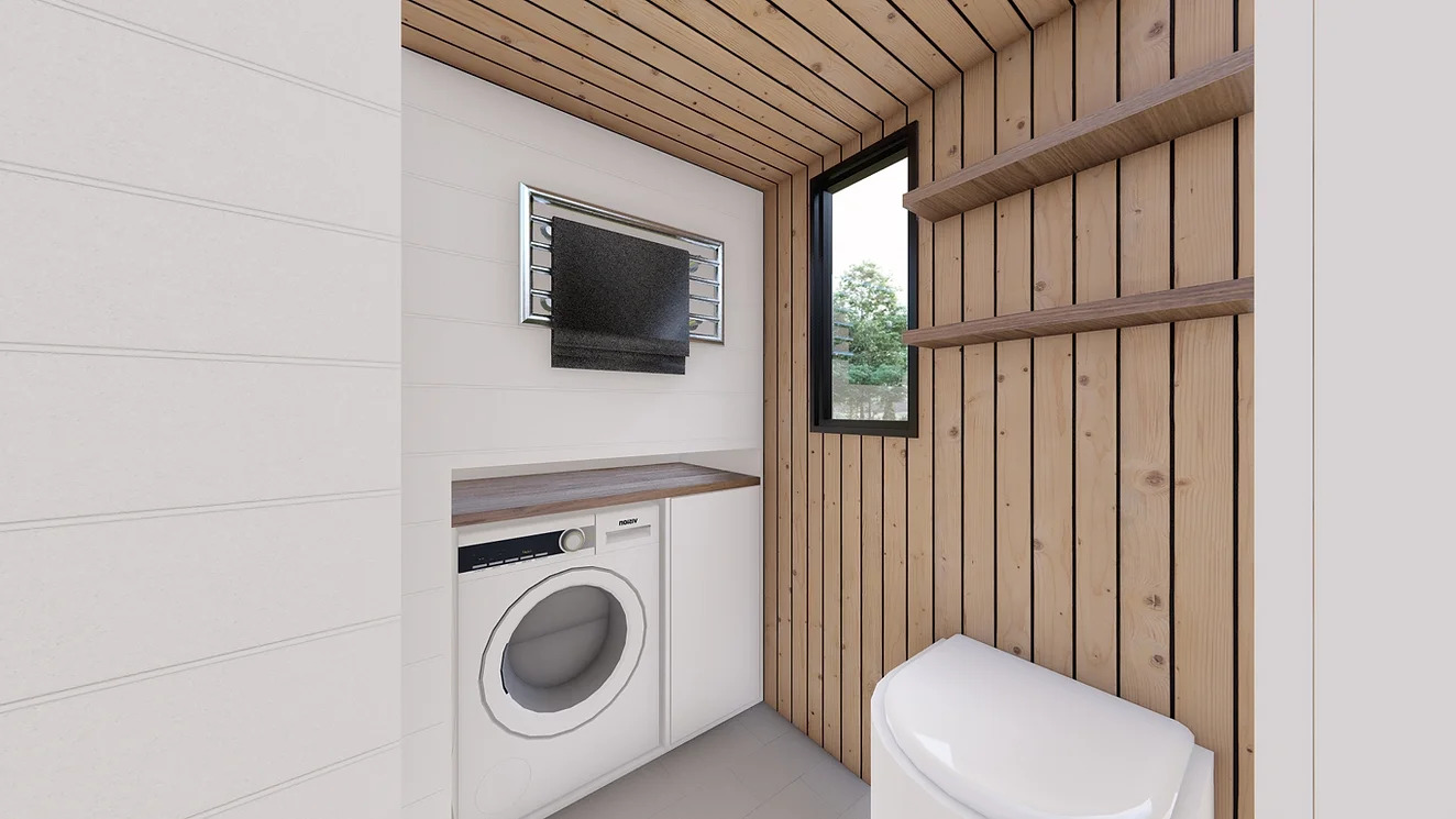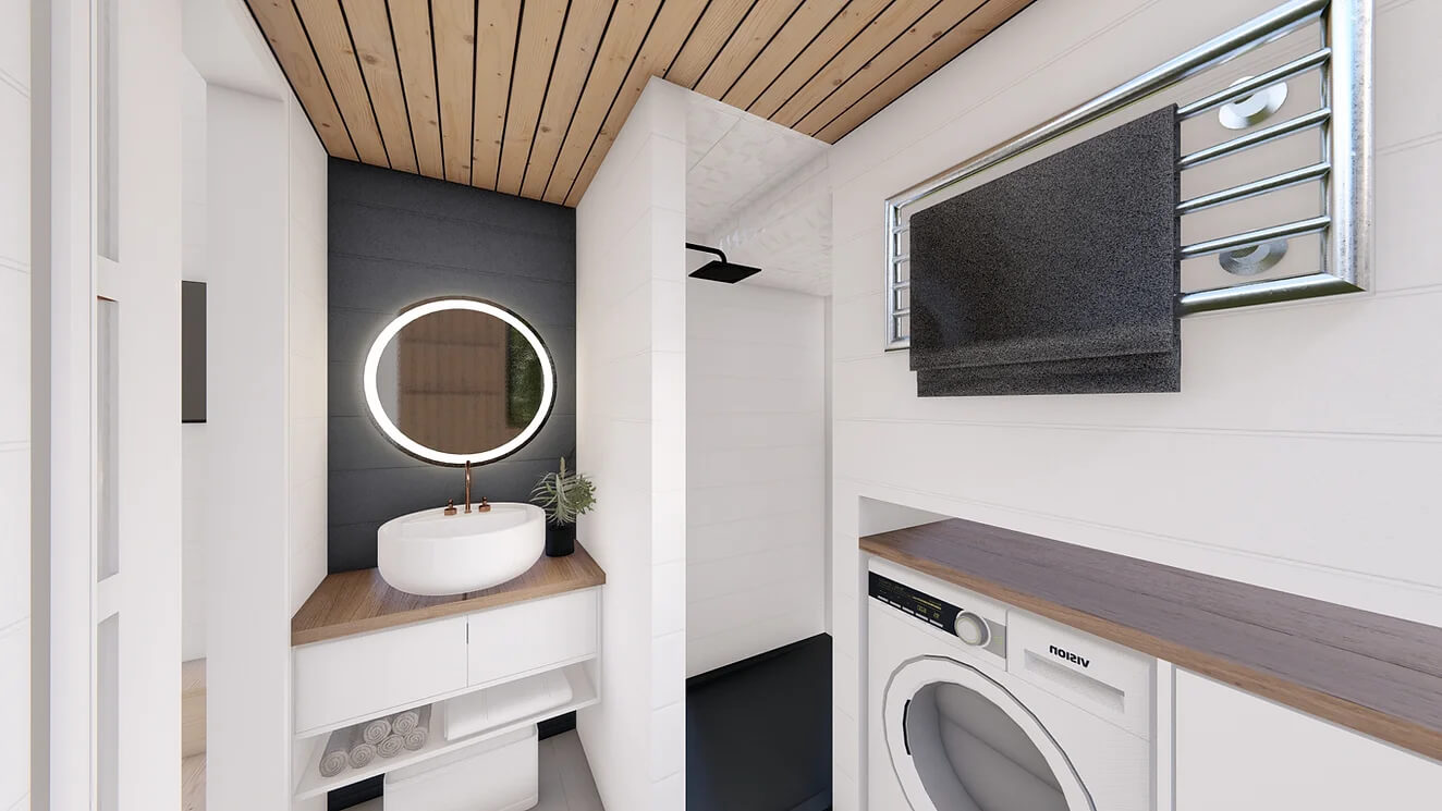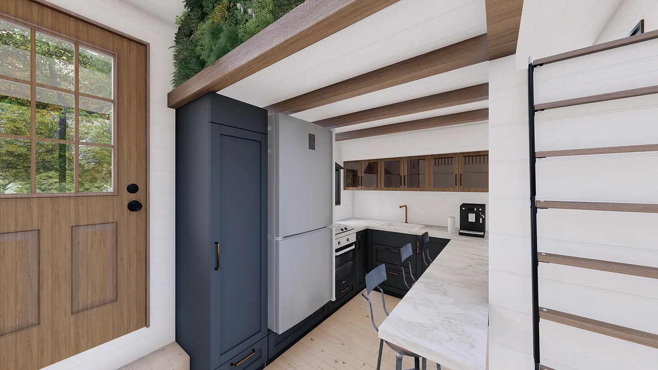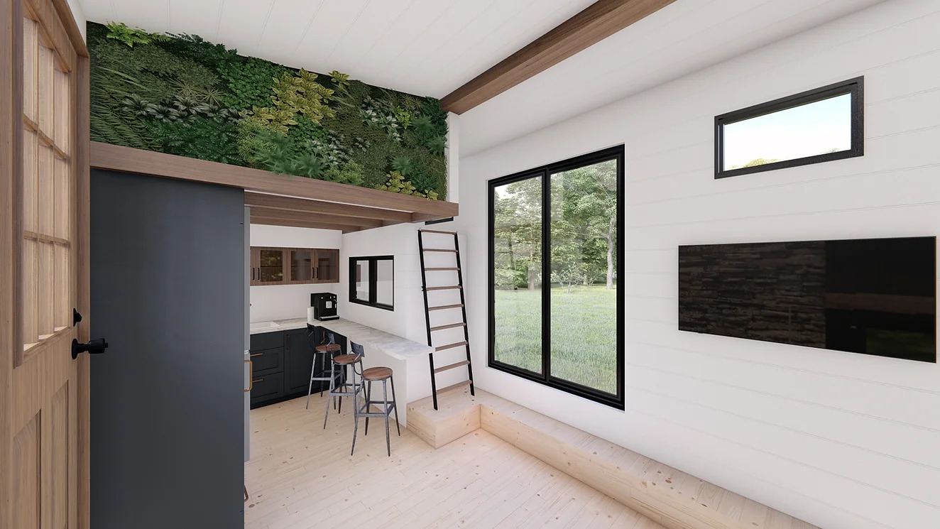 For those seeking sustainable living, the True North Retreat offers solar systems and fully off-grid packages, along with home automation options. Additionally, the exterior and interior can be upgraded with stylish plant walls, available in both faux and live options, adding a touch of nature to this thoughtfully designed Tiny Home.