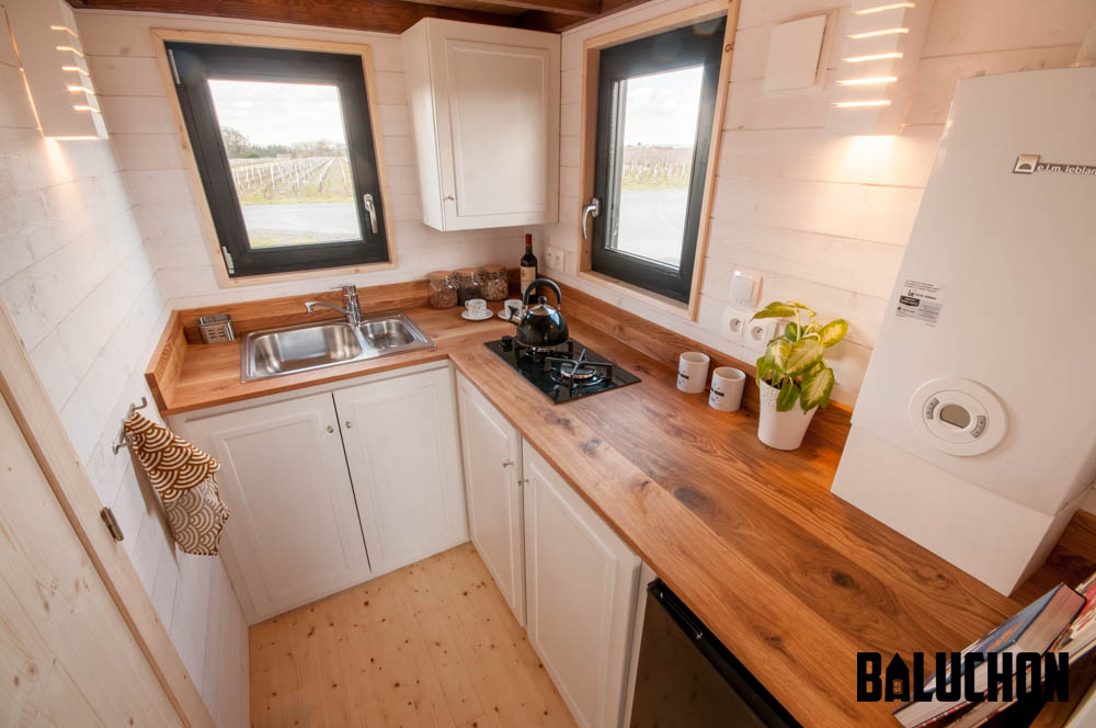 With all the common necessities, and with built-in furniture throughout, this tiny home on wheels is a great example of a simple yet liveable tiny house.