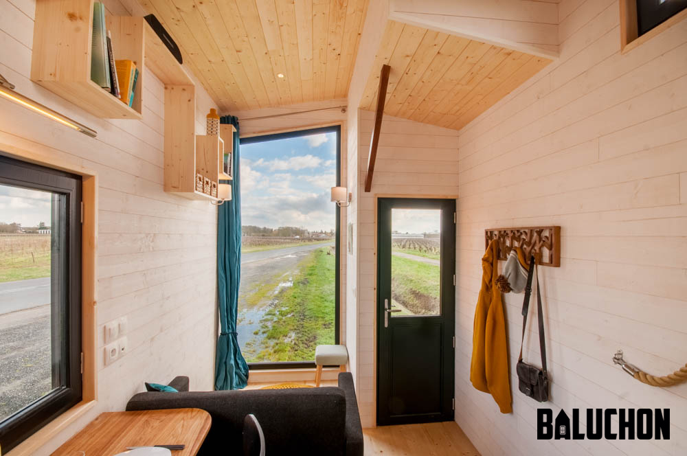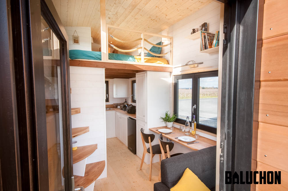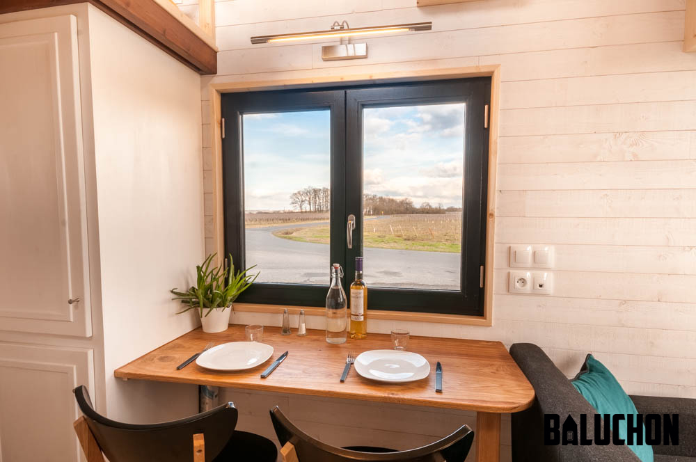 Inside the Utopia, you’ll find whitewashed walls and charming design. A floor to ceiling window sets the stage for an intimate living room and with a built-in dining table for two makes this ideal for a couple.