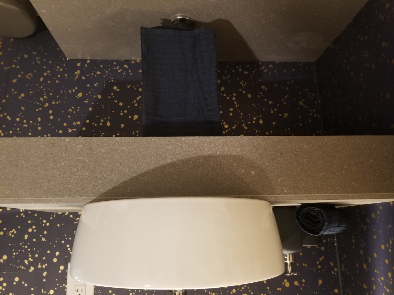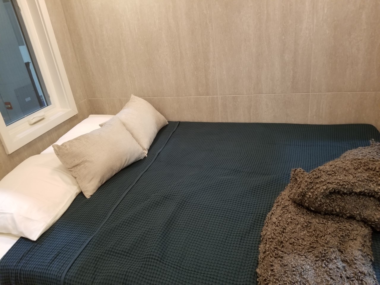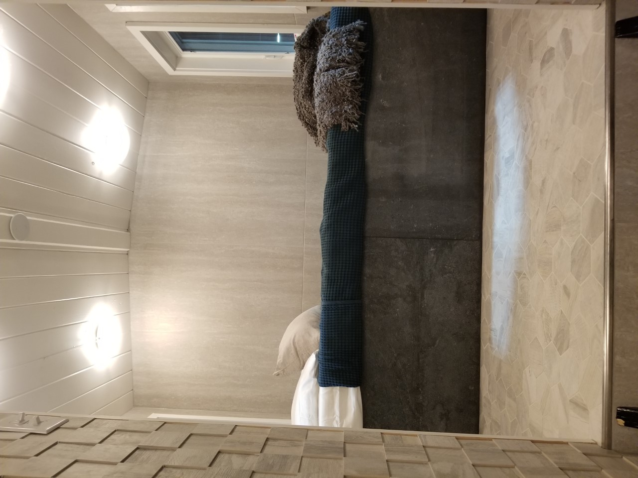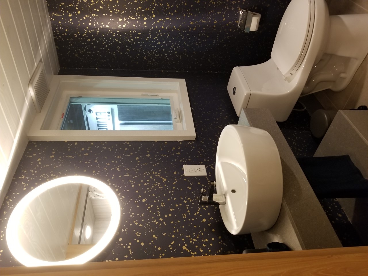 The bedroom loft has additional space to provide more comfort and can accommodate a queen sized mattress to smoothly sleep up to two people. The ceiling lights paired with the big windows together lighten up the bedroom loft throughout the day and night. The stellar design of the bathroom is truly captivating. You get a very chic vanity with a unique style along with an acrylic toilet to complete the bathroom look.
