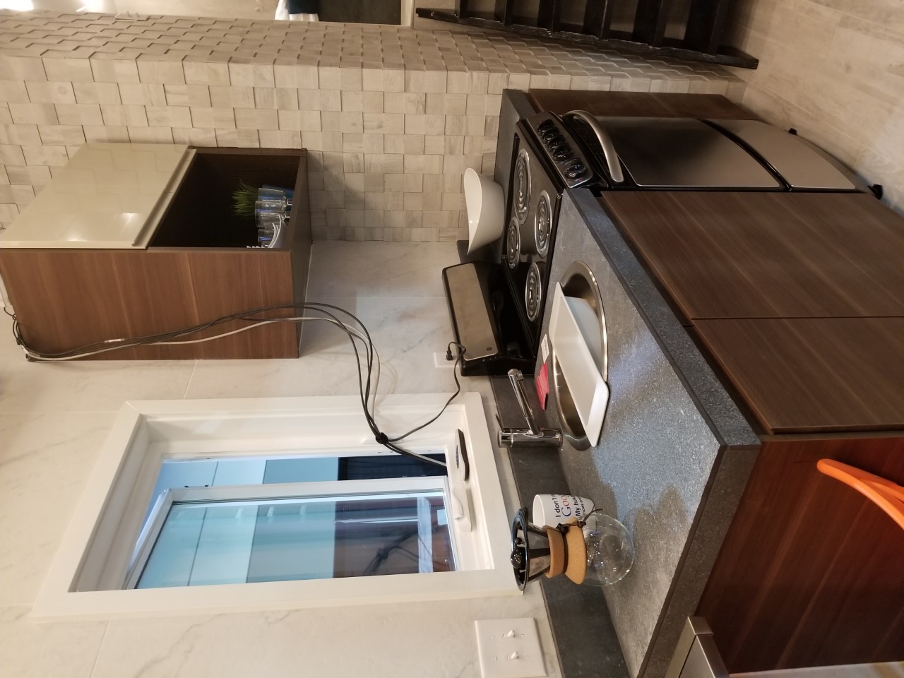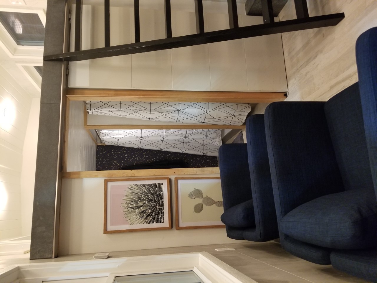 The great room is commodious and can hold two single plush sofas. The open kitchen with a broad countertop is equipped with a four burner gas stove, a round stainless steel sink with a faucet and an oven. You also get a multitude of cabinets to store cooking appliances or utensils. The adjacent wall has an intricate square chip design that adds an extra element to the interior style and has a snazzy appeal. A dark brown ladder is accessible from the living room that takes you up to the bedroom loft.