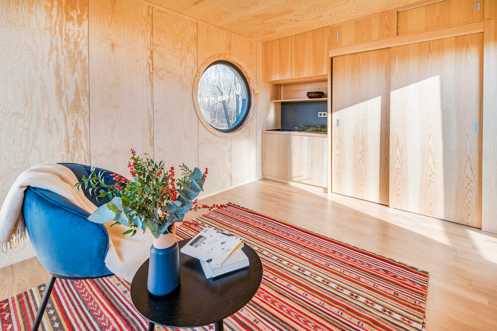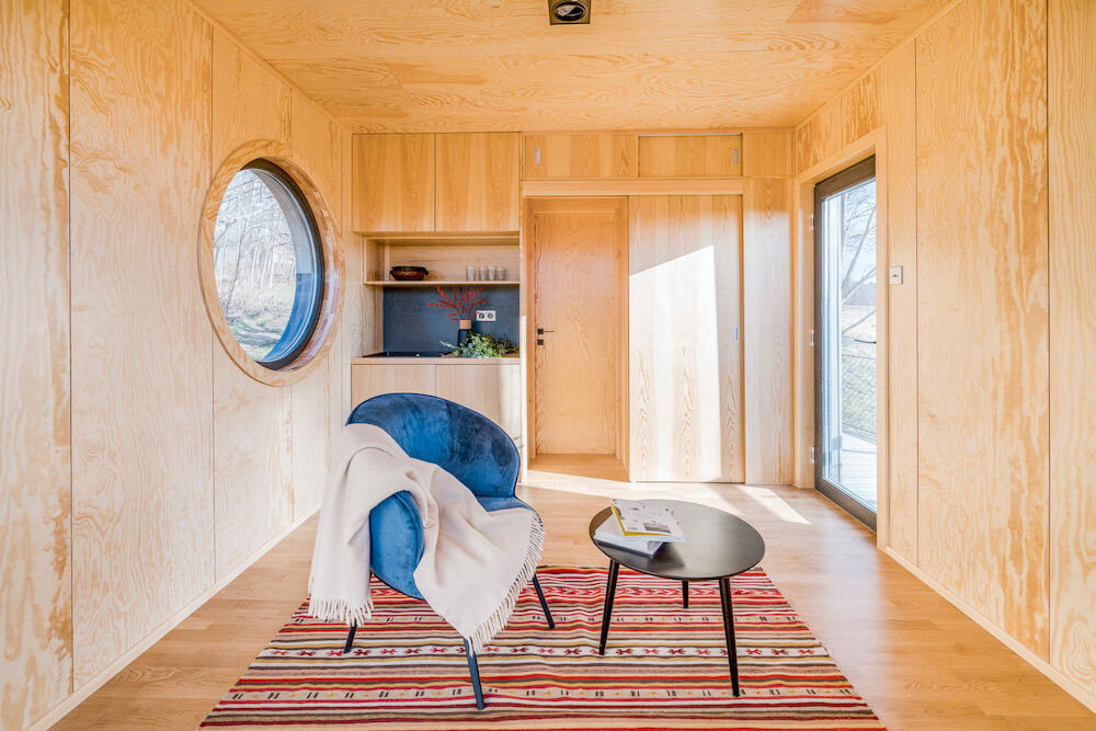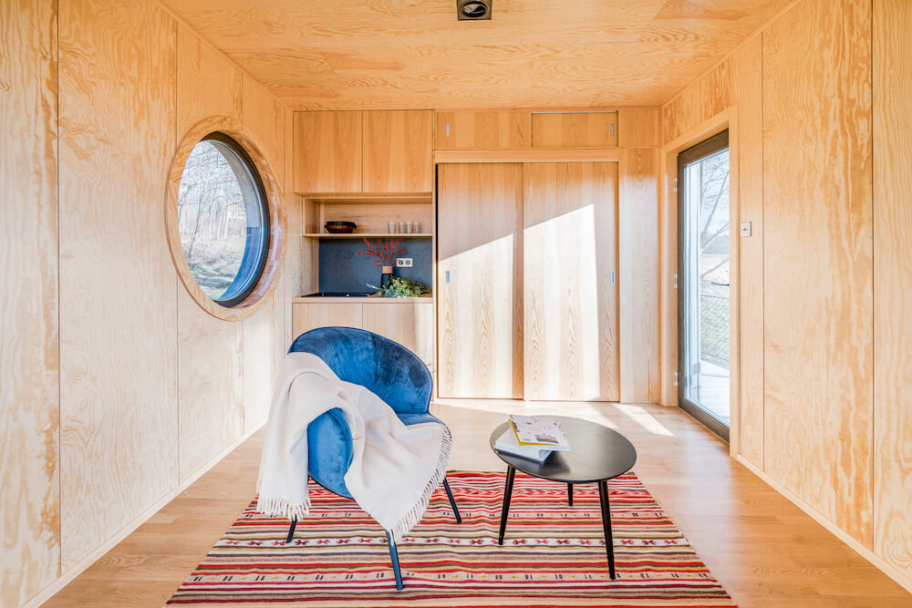 The WauHaus (pronounced Wow-House!) designed and built by Hello Wood is truly one of a kind. It's been designed with minimalism in mind. Not only in regards to the build, but also with encouraging a minimalist life style. The 24 foot long by 8 foot wide tiny home sits on four pillars suspended from the hill slope, giving the tiny house a floating feeling – almost looking weightless.