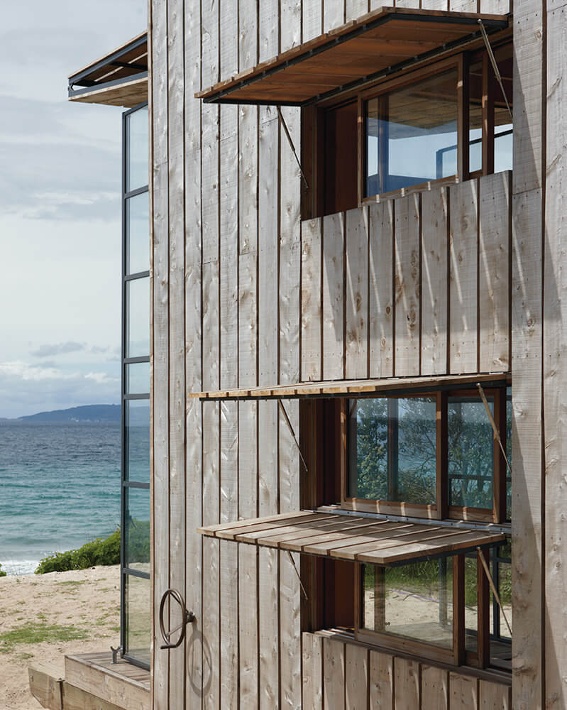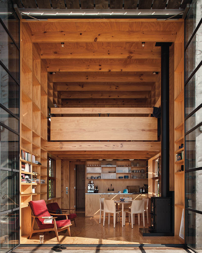 The two-storey shutter on the front façade winches open to form an awning, shading the interior from summer sun while allowing winter sun to enter. It reveals double-height steel-framed glass doors that open the interior much like a tent flap, connecting the living room and the mezzanine bedroom to the extraordinary view.
