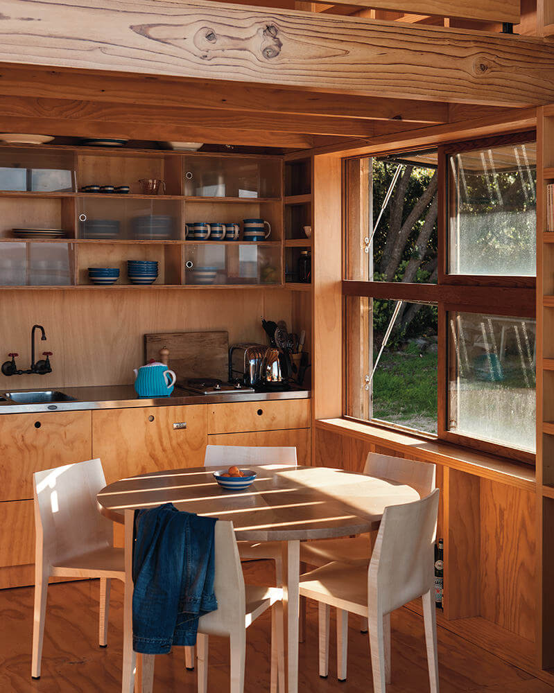 "The clients’ desire for sustainability is evident in the modest building size, the use of timber in cladding, structure, lining and joinery, and the manually operated mechanisation. Apart from food delivery and non-recyclable waste removal, the hut functions as a self-sustaining organism with rain-catchment tanks, a worm-tank waste system and separate potable and grey-water tanks." - Crosson